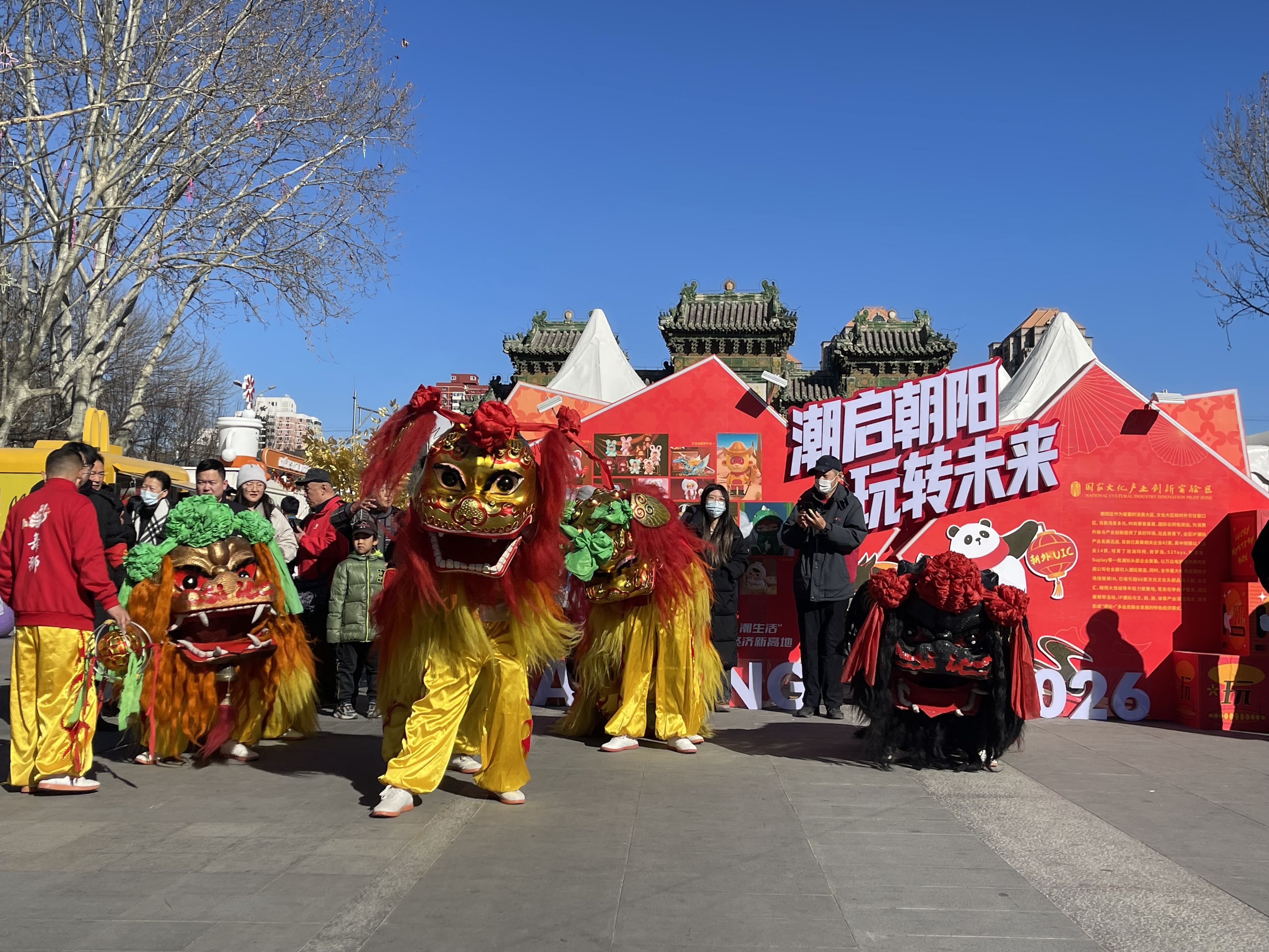 东岳庙广场上的舞狮表演。新京报记者 吴婷婷 摄