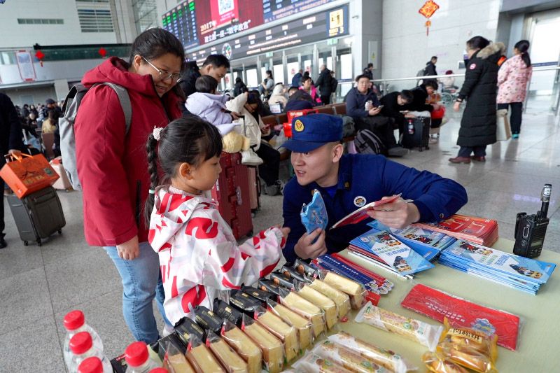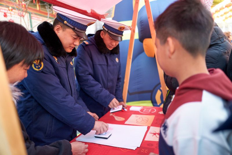 厂甸庙会入口处,消防员为来往游客完成集章互动。正月初一至初七(2月17日至23日)庙会举办期间,西城区消防救援支队在厂甸庙会及大观园庙会现场同步设立“消防科普互动专区”,通过寓教于乐的方式提升群众消防安全意识。