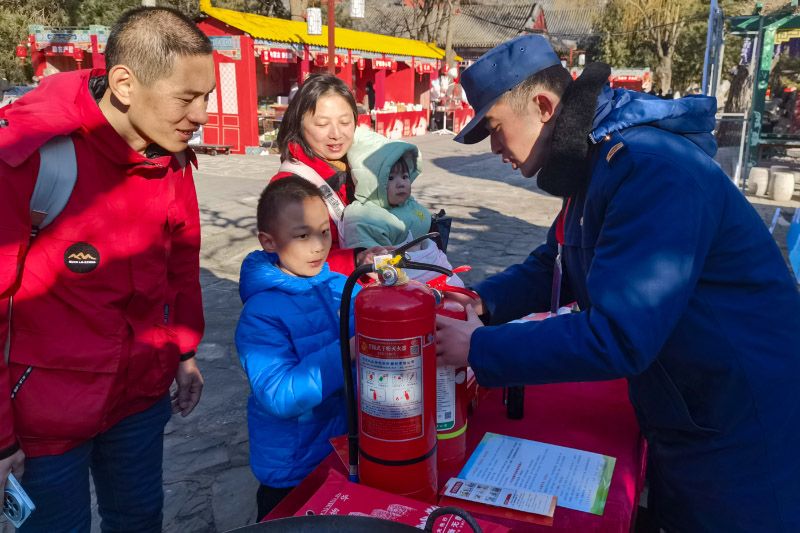 大观园庙会,消防员为小游客讲解灭火器的使用方法。游客可以亲身参与“模拟灭火器灭火”“逃生面罩使用”等互动项目,学习实用的消防技能。