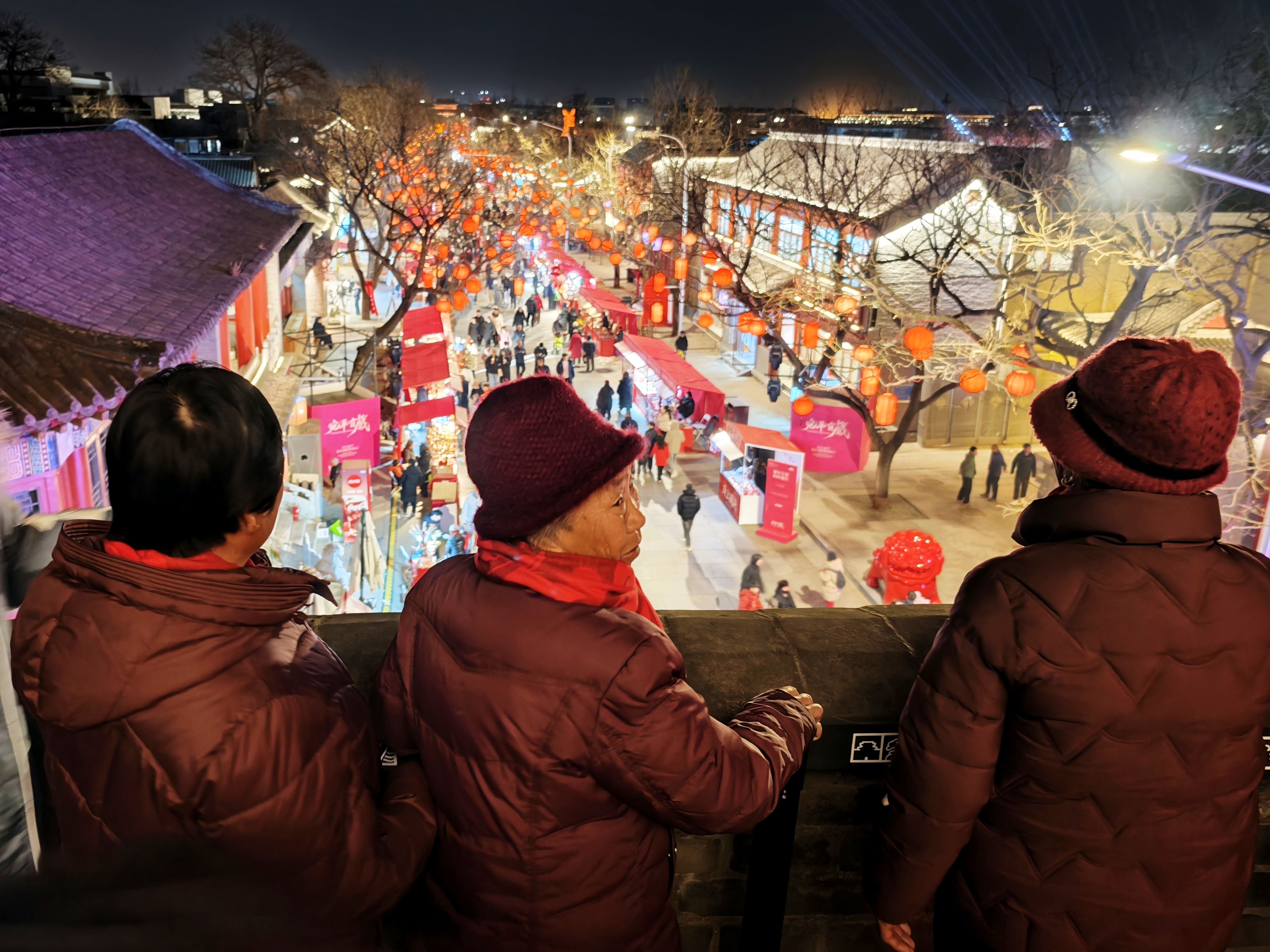 近日,37岁的山东临沂小伙子郁章宝为了圆妈妈的“北京梦”,出资包车带着全家15口人进京旅游过年。从腊月二十八到大年初二,他们游览了长城、前门、故宫、天坛、圆明园等热门景点,2月18日晚是在北京度过的最后一晚,在丰台区文旅局工作人员的邀请下,他们来到夜色中的宛平城,在戏曲与国潮交织的宛平新春庙会中,感受新年的喜庆热闹氛围。“北京的热情让我们感动、难忘!”
