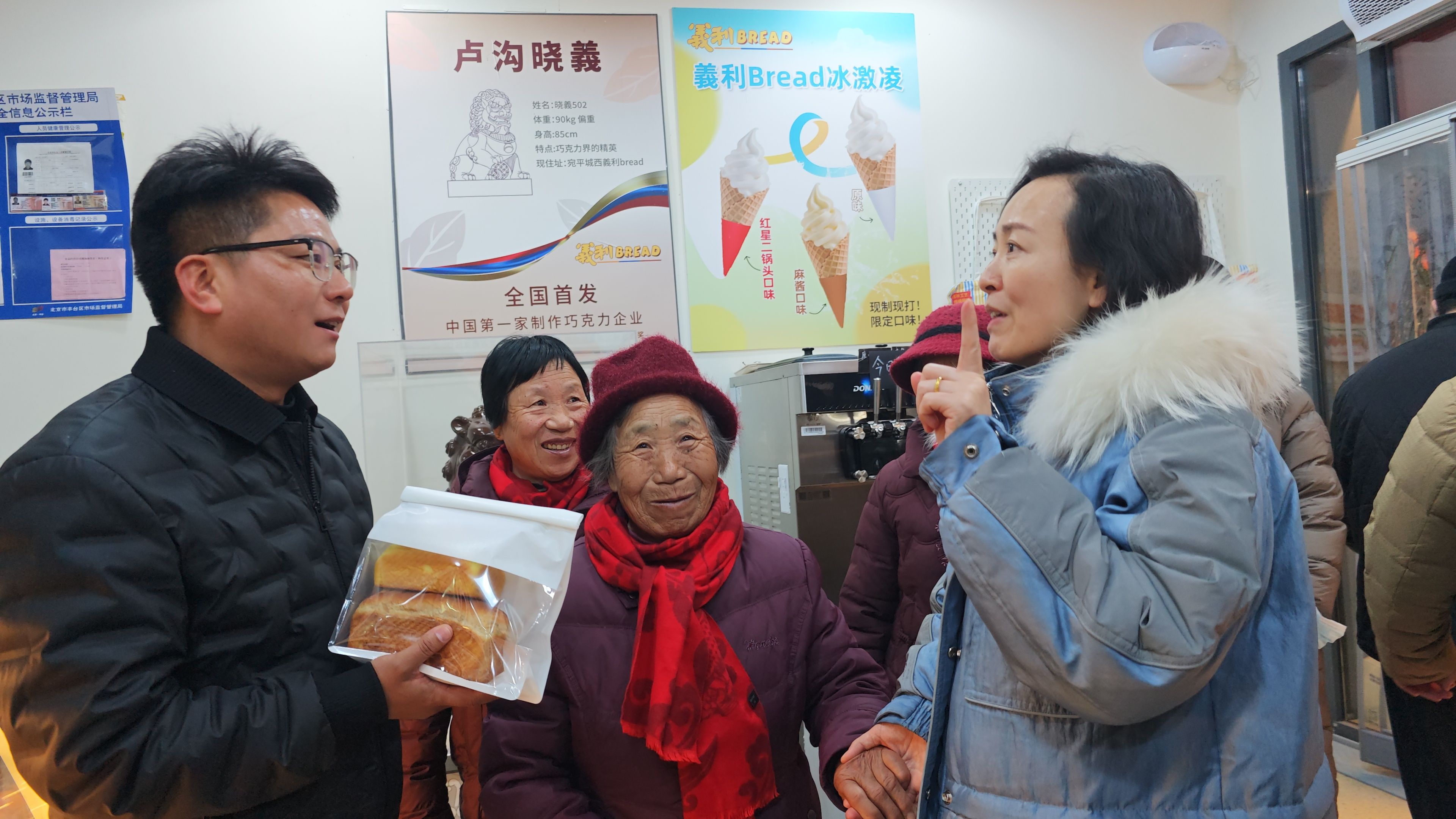 丰台区文旅局局长吴婧给一家人推荐总书记买过的同款面包。新京报记者 王巍 摄