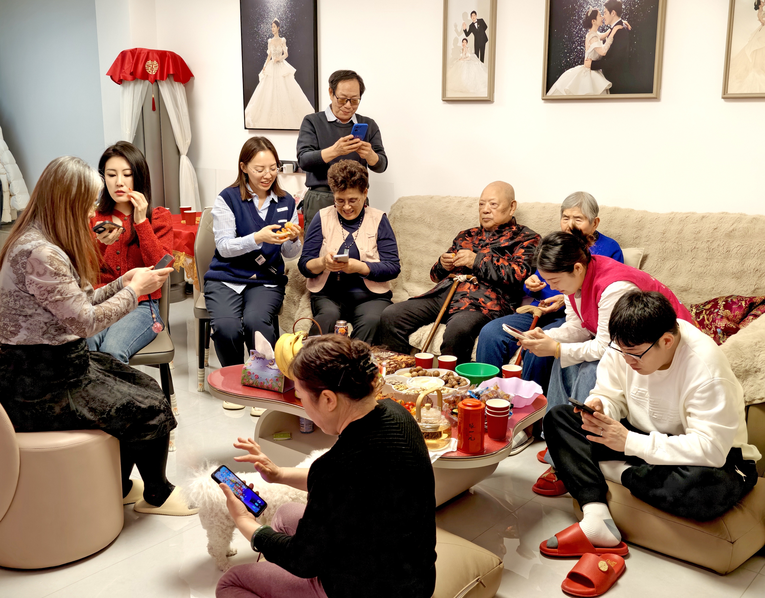 ▲2月16日除夕夜,北京某市民一大家,围坐在电视机前看春晚、抢红包。图/IC photo