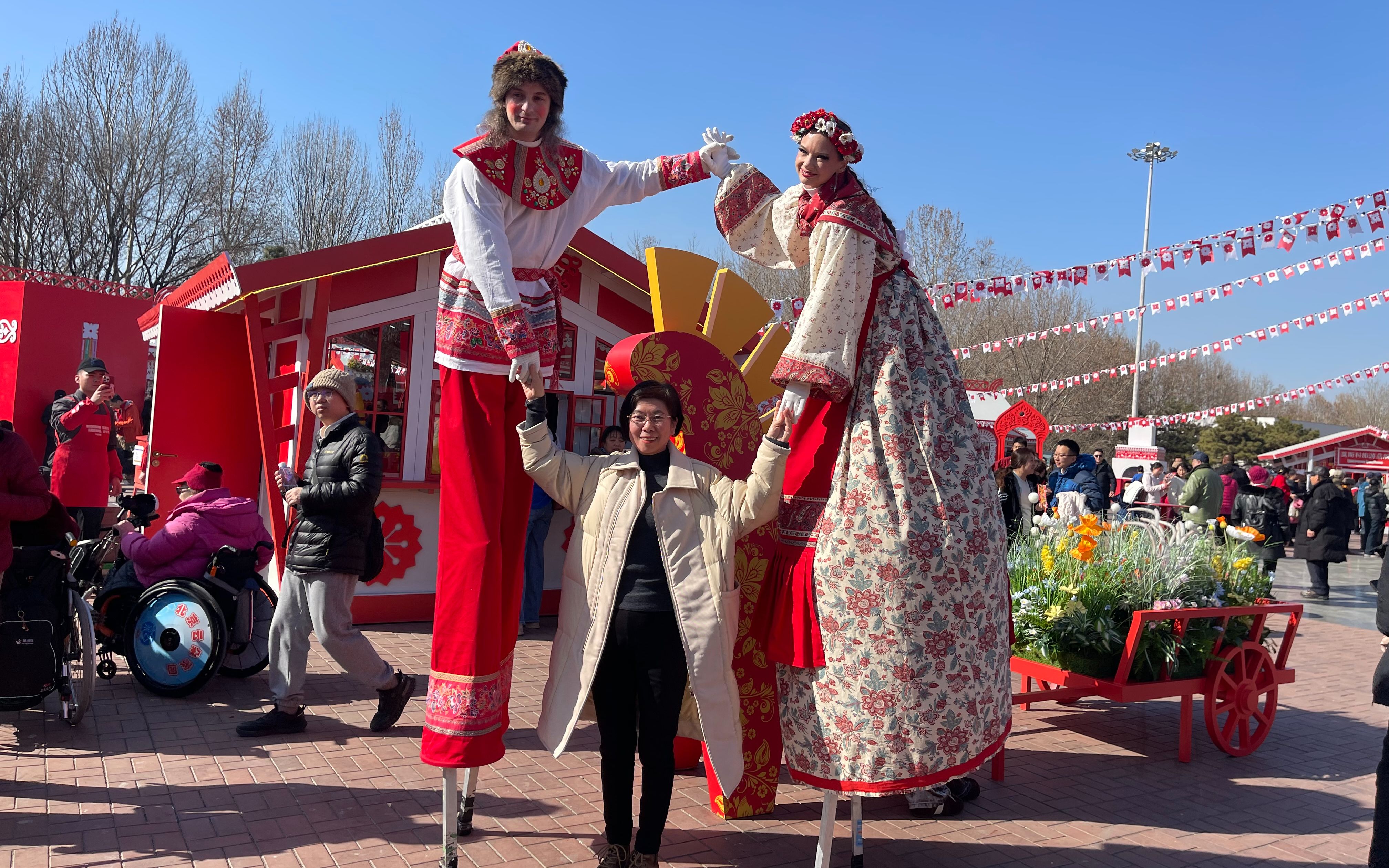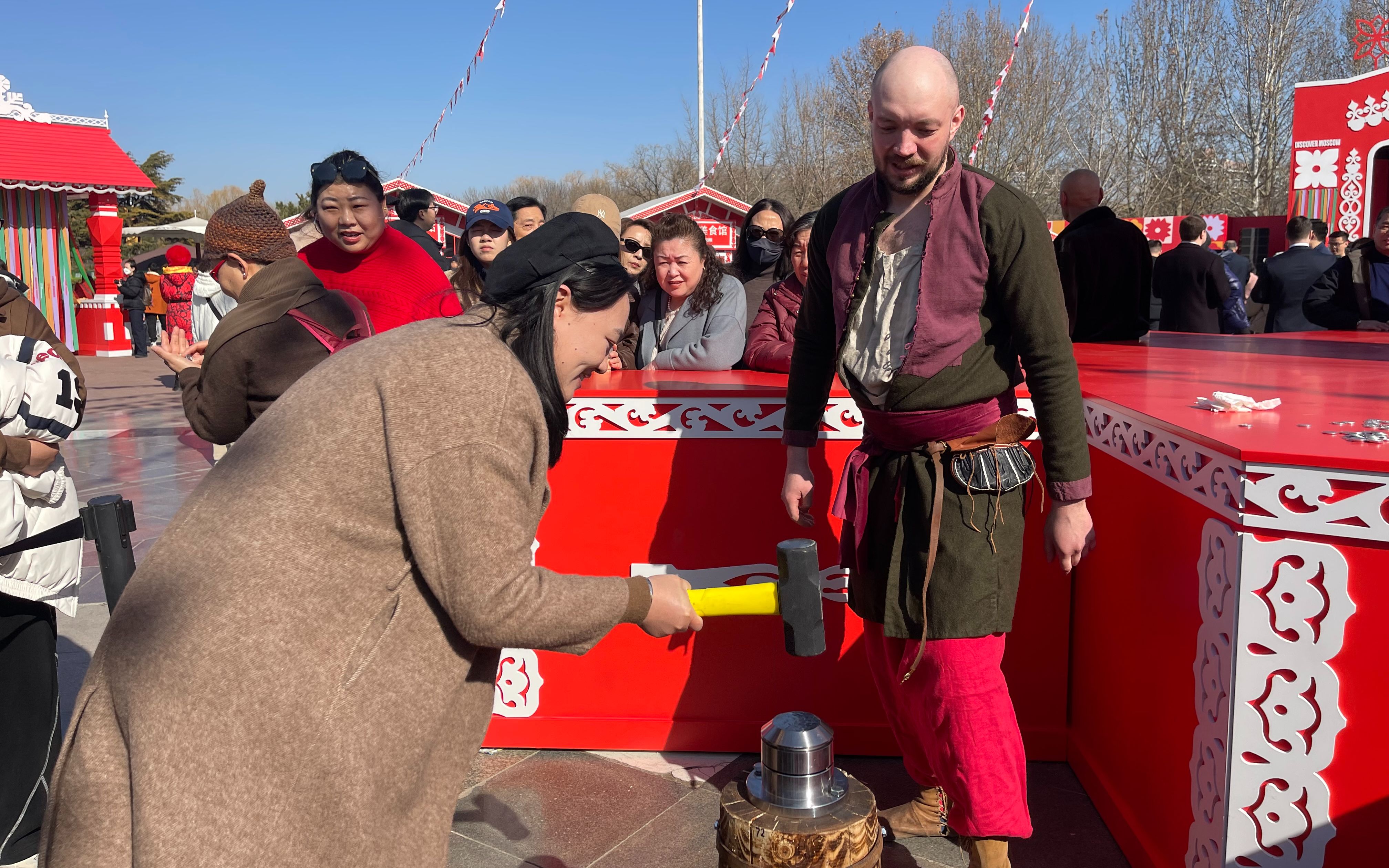 步入朝阳公园礼花广场,浓郁的莫斯科风情扑面而来。现场被精心打造成充满俄式韵味的主题集市,标志性的送冬节柱、复古的茶炊装置,与不远处的大红灯笼交相辉映。现场播放着欢乐的俄罗斯音乐,活动区域俄罗斯演员亮出拿手绝活,踩独轮车、踩高跷、表演杂技……演员们热情地与市民游客互动。在跳大绳的活动中,两名身材壮硕的俄罗斯演员担起了摇绳 “重任”,如果是孩子们跳绳,他们摇得节奏适当,如果是大人来跳绳,他们则会小小“捣乱”,惹得观众笑声不断。
