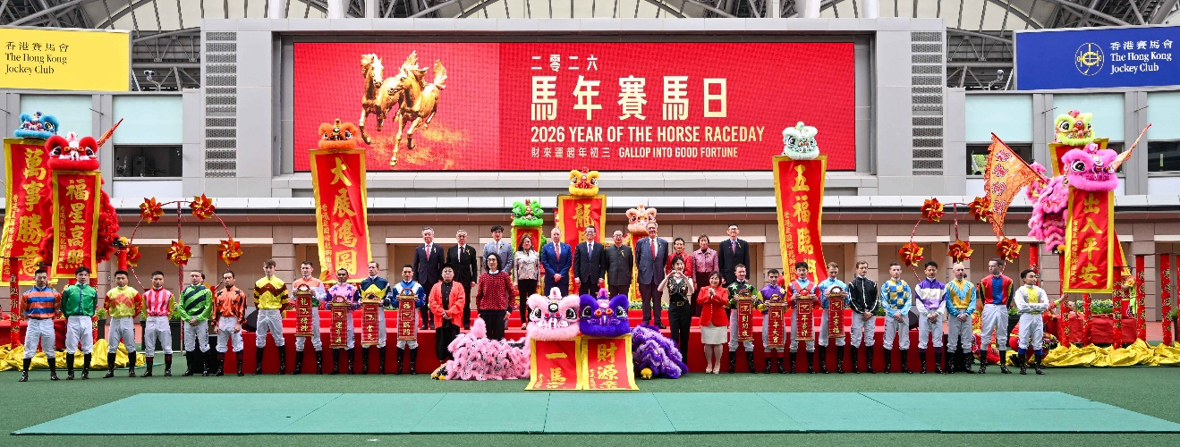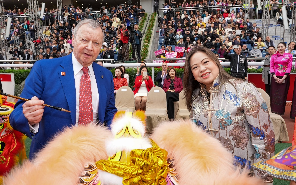 随后,香港特别行政区政府财政司司长陈茂波、香港特别行政区政府文化体育及旅游局局长罗淑佩与香港赛马会高层为醒狮点睛。一众骑师也盛装登台,拱手拜年,以飒爽英姿为赛事拉开序幕。