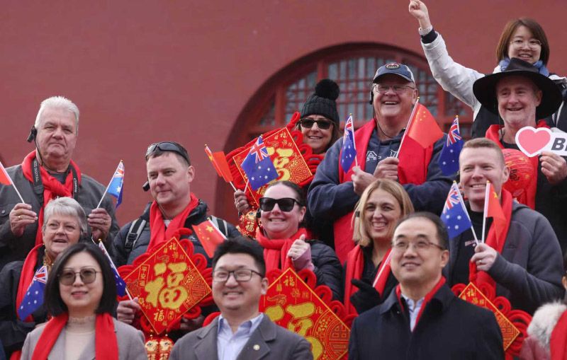2月20日正月初四,北京中轴线北端的鼓楼红墙映福、鼓乐和鸣,60名澳洲游客登上鼓楼,和中国游客一起过中国年。记者从北京市文旅局获悉,今年将有万名澳洲游客畅游北京。马年春节假期前5天,北京接待入境游客7.6万人次,同比2025年增长46.2%。