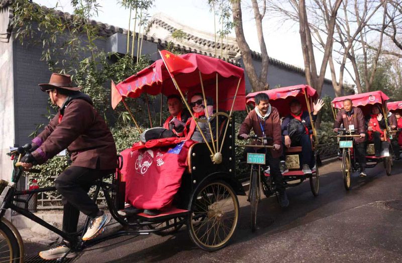 人力三轮车车铃响起,车夫们载着60名澳洲游客游览后海胡同。