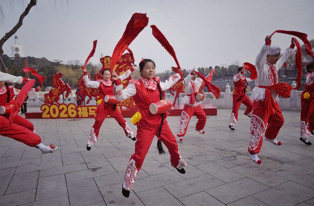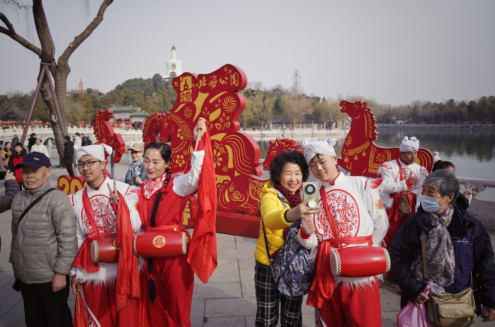 2月21日,大年初五,北海公园,安塞腰鼓表演吸引了不少游客。初一至初七,北海公园每日上演三场非遗安塞腰鼓表演,为市民游客营造喜庆祥和热烈的年味。