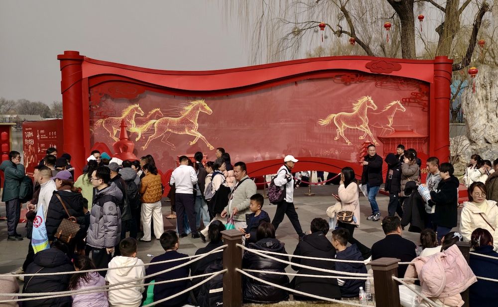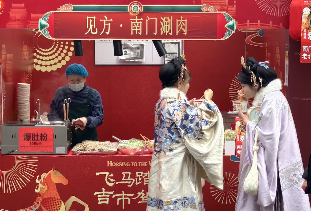 南门涮肉等特色美食摊位前,身着汉服的游客排队品尝,烟火气十足。美景、美食勾勒出京城正月初五热闹红火的文旅画卷。