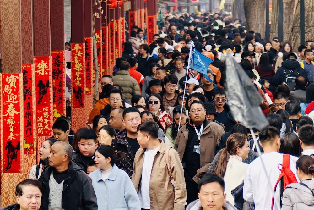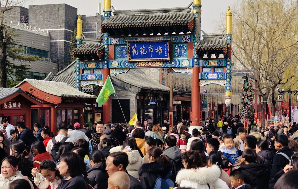 古色古香的“荷花市场”牌楼之下,游客络绎不绝、摩肩接踵,处处洋溢着迎财神的喜庆氛围。