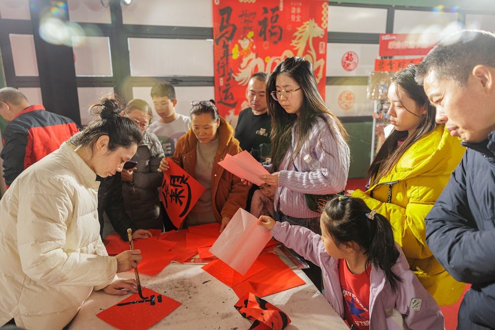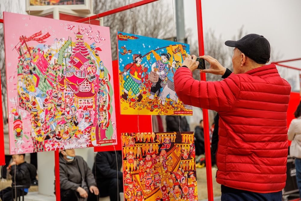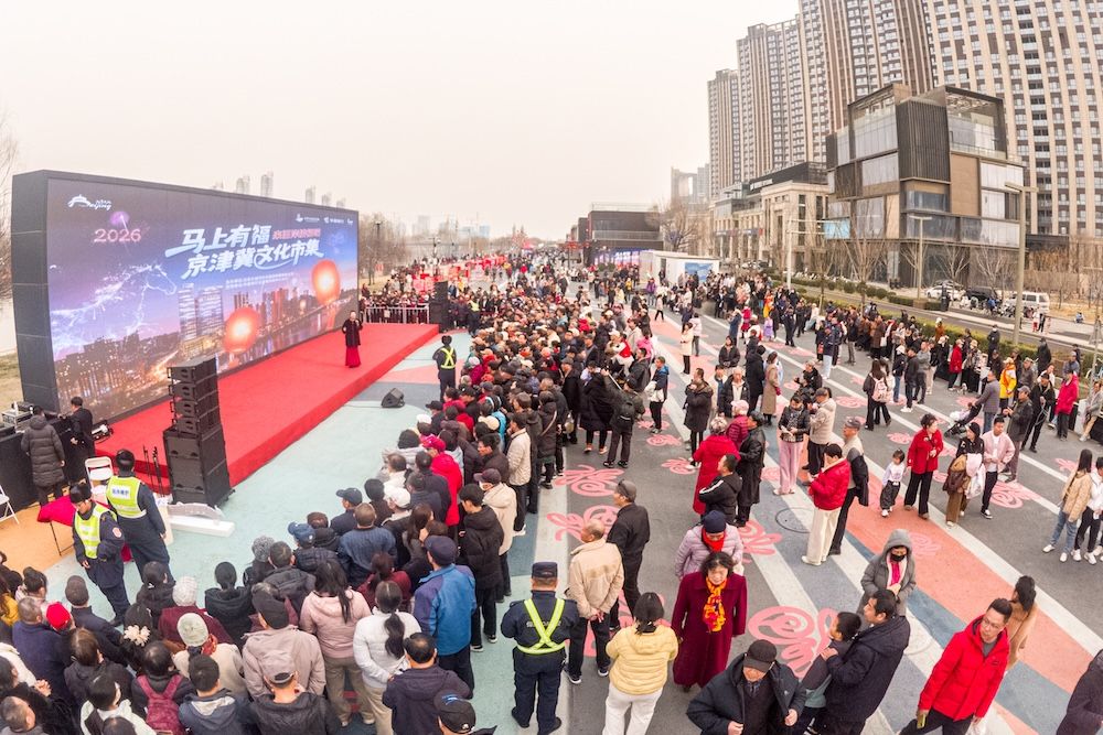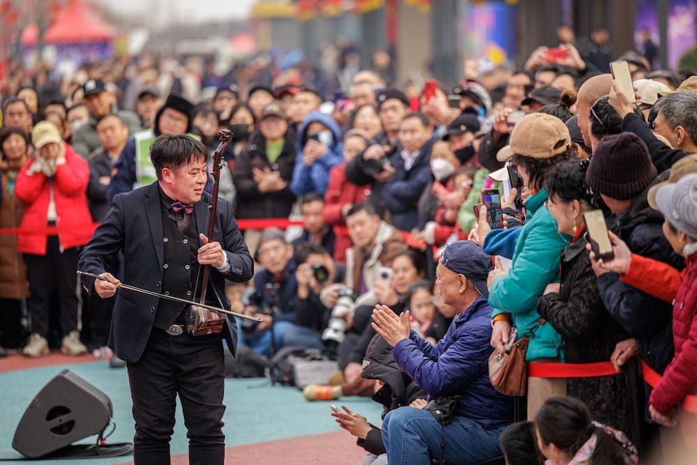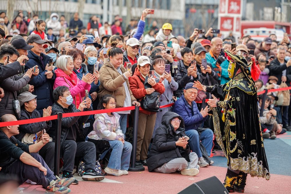 2月21日,通州区运河西岸“马上有福”京津冀文化市集热闹持续。三大舞台精彩不停,非遗节目、舞蹈、评书、相声等节目轮番在主舞台上演。初五迎福,市集内设置多款互动游戏,与游客互动,为游客现场送“福”字。图为运河西岸,精彩的文艺演出吸引游客围观。
