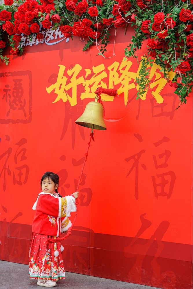小朋友摇动好运铃铛。