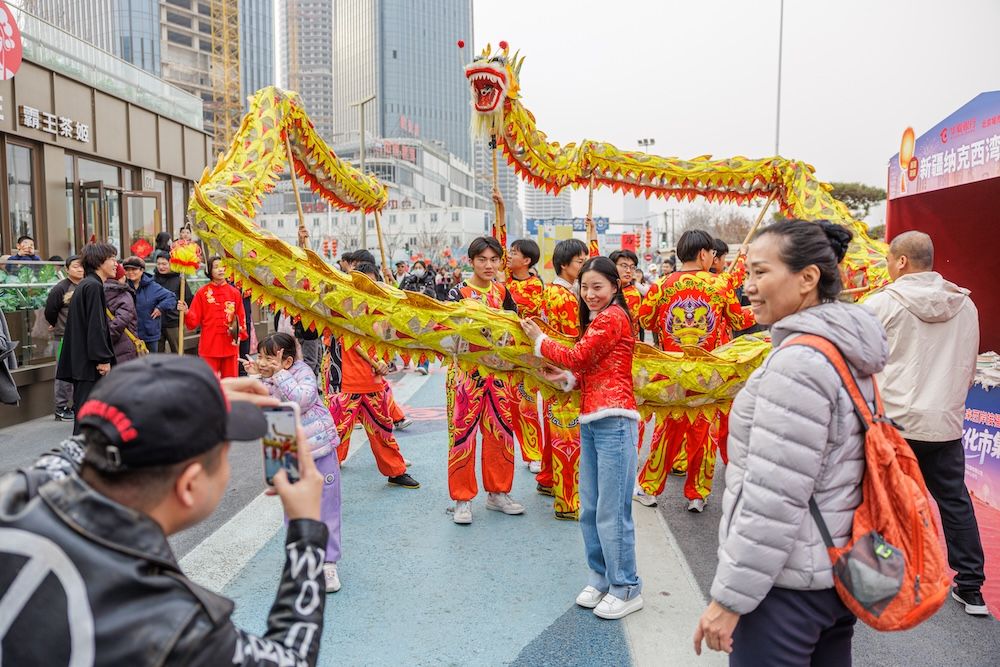 市民与舞龙队合影。