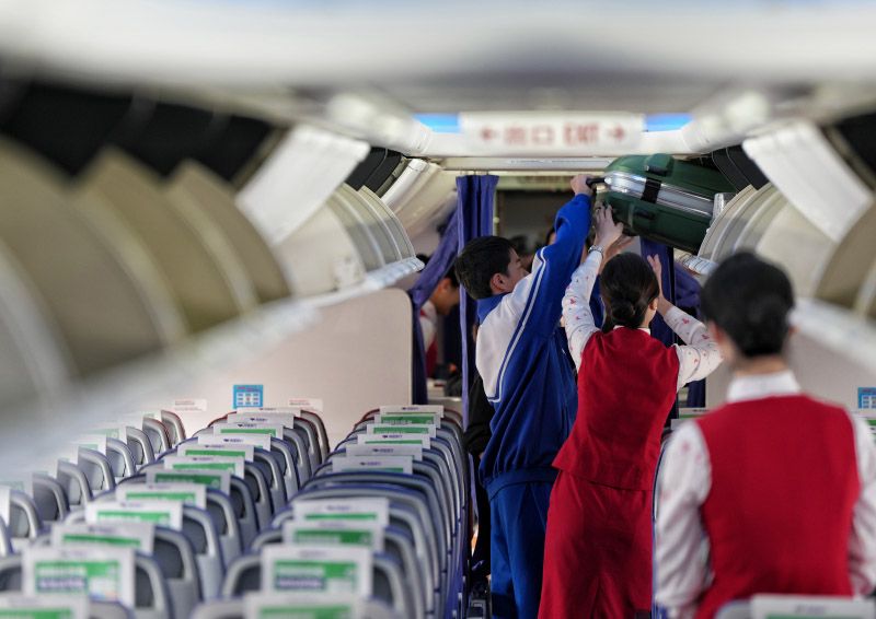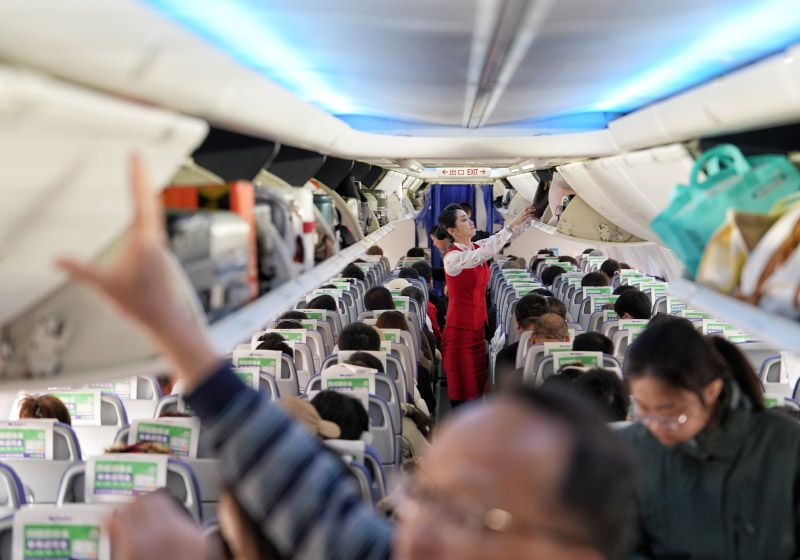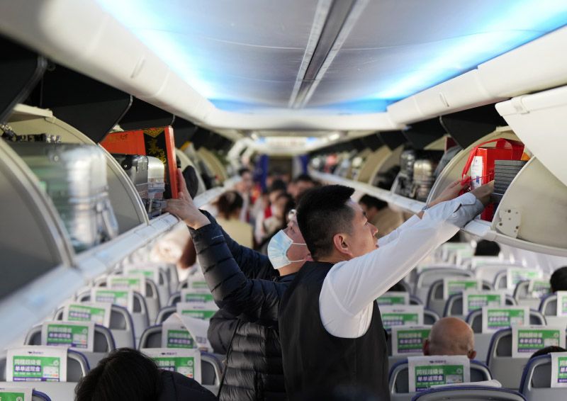 2月22日,襄阳刘集机场,前往北京的ZH9152航班上,机组人员帮助旅客放置行李。据了解,机组人员针对返程高峰的客流特点制定了专项服务保障方案。乘务长表示:“我们希望能用温暖的微笑和贴心的服务,让这段旅程成为返岗路上的温馨驿站。”