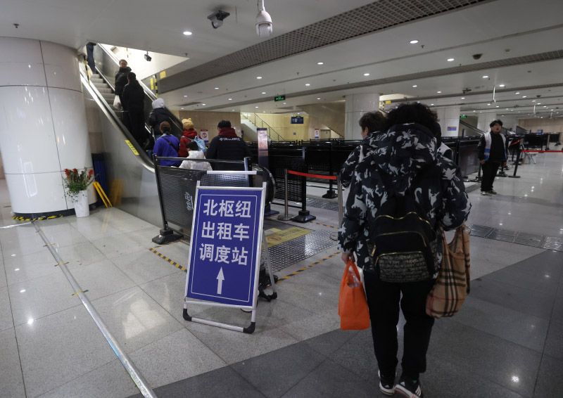 旅客前往北枢纽出租车调度站候车。目前,北京南站地区有北枢纽调度站和东调度站两个出租车调度站,其中的北枢纽调度站已经改造为出租车上车点。乘坐出租车可前往北枢纽调度站和东调度站,乘坐网约车的乘客,需要前往西地下P1、P2或东地下P3、P4停车场。