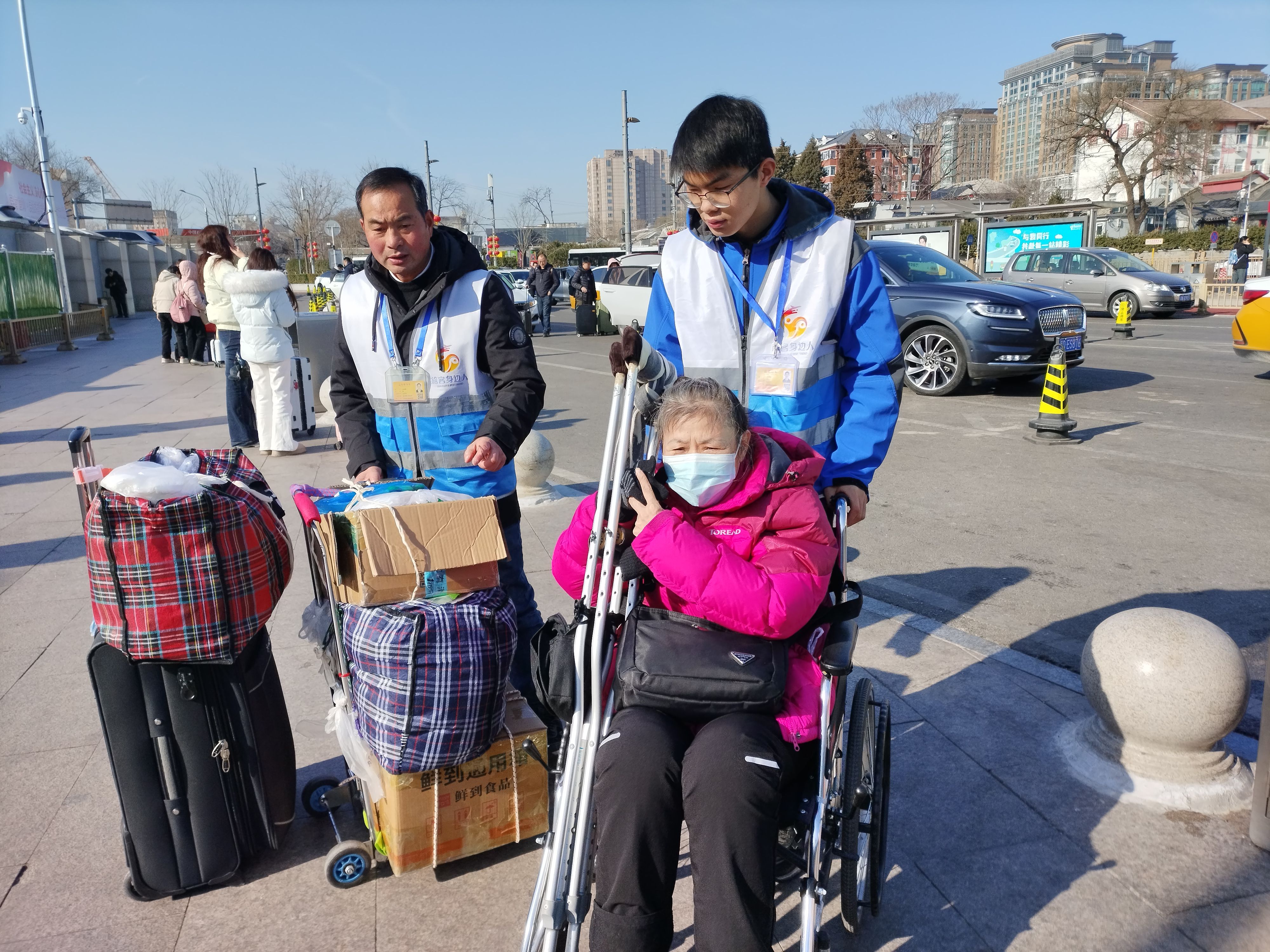 正月初四这天,她遇到了一个让她“眼泪差点掉下来”的瞬间。一位脚踝受伤的年轻人返京上班,刘翚推着轮椅把她送到广场外的网约车站点,帮忙搬好行李,车已经开出去,年轻人还在回头冲她挥手。