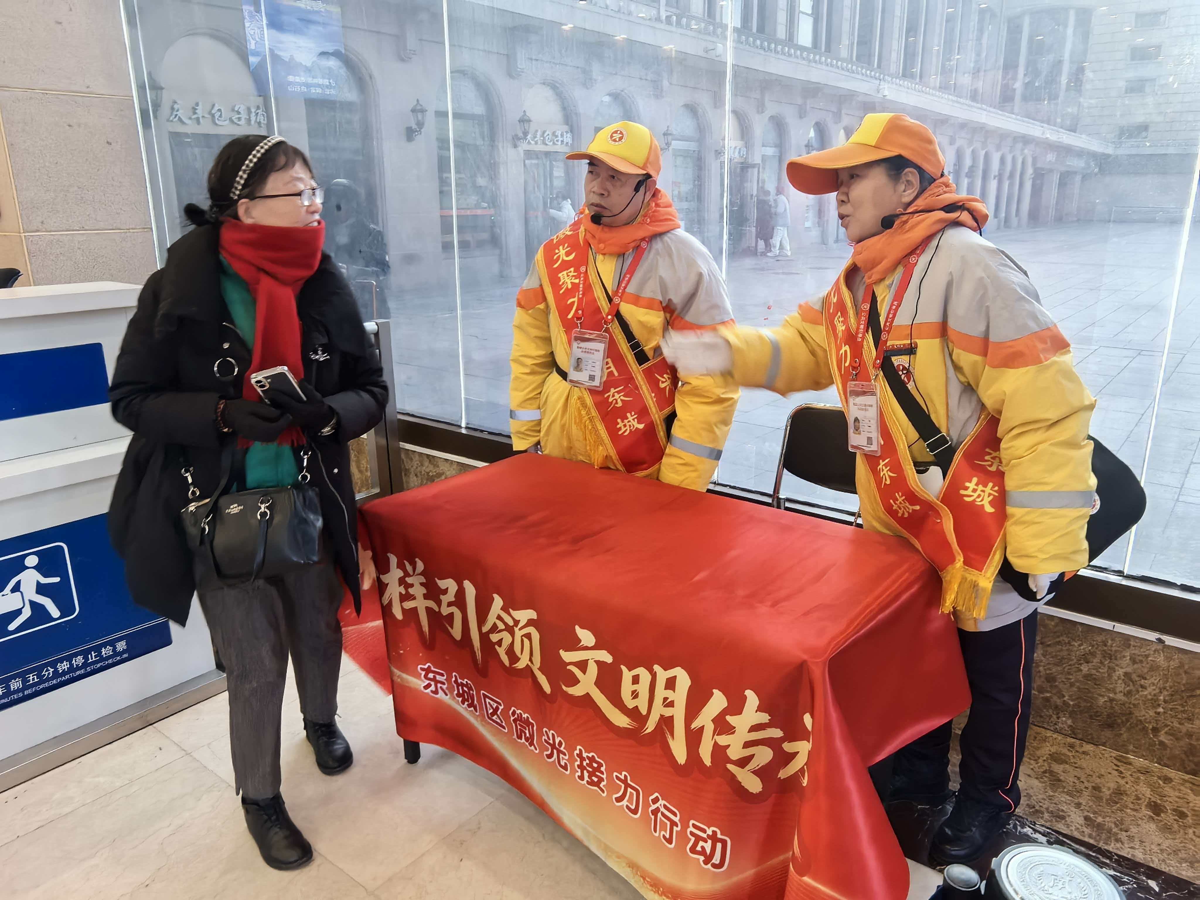 东城区建国门街道的站东义务指路队志愿者在北京站帮助旅客。