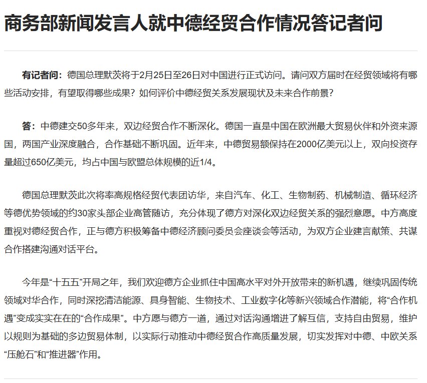 有记者问:德国总理默茨将于2月25日至26日对中国进行正式访问。请问双方届时在经贸领域将有哪些活动安排,有望取得哪些成果?如何评价中德经贸关系发展现状及未来合作前景?
