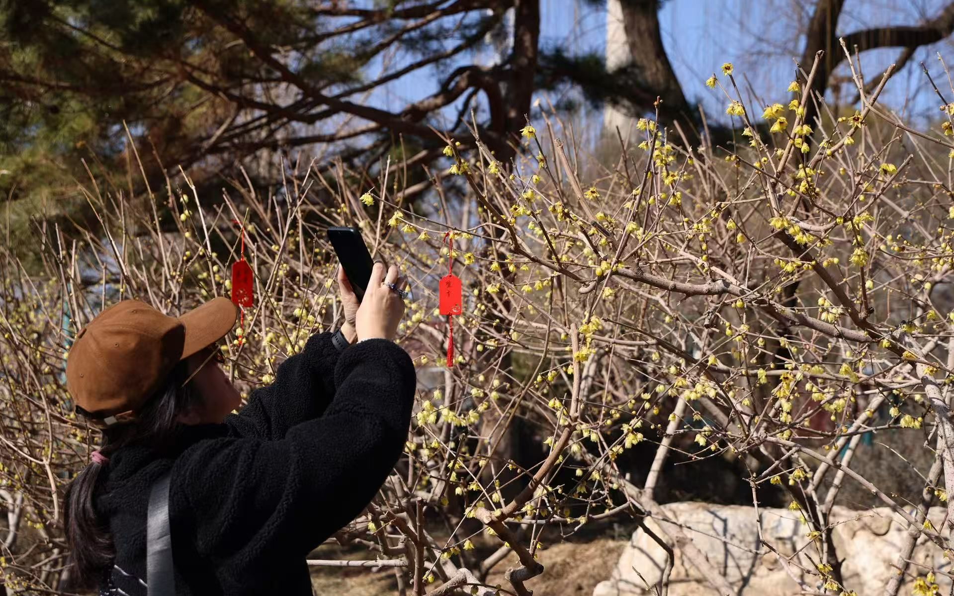 玉渊潭公园西南门至樱珞花谷沿线的300余株蜡梅已经盛放,芳香四溢、清甜醇厚。这些蜡梅涵盖10余个品种,花期可持续至3月初。