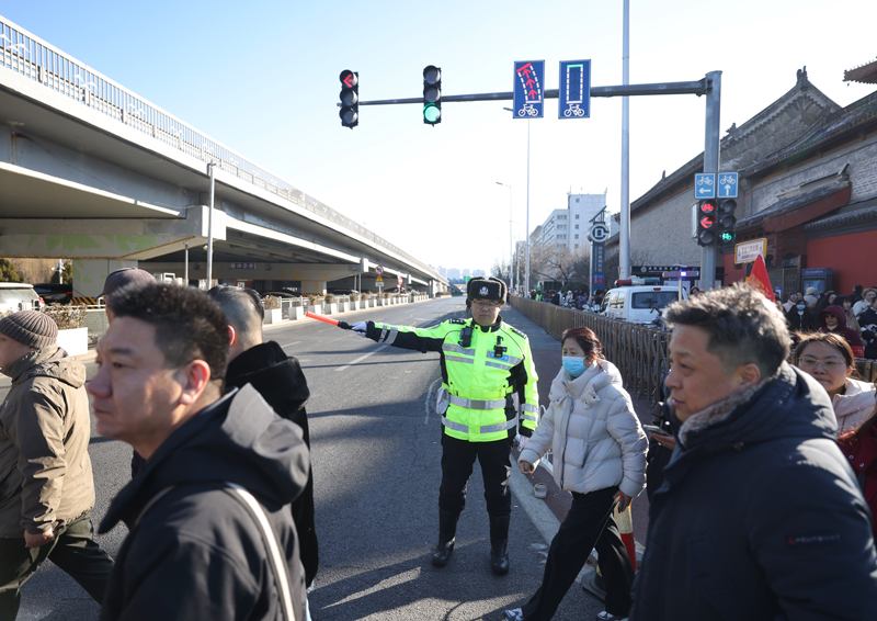 2月17日上午10点,东城交通支队和平里大队的民警正在疏导交通。新京报记者 王贵彬 摄