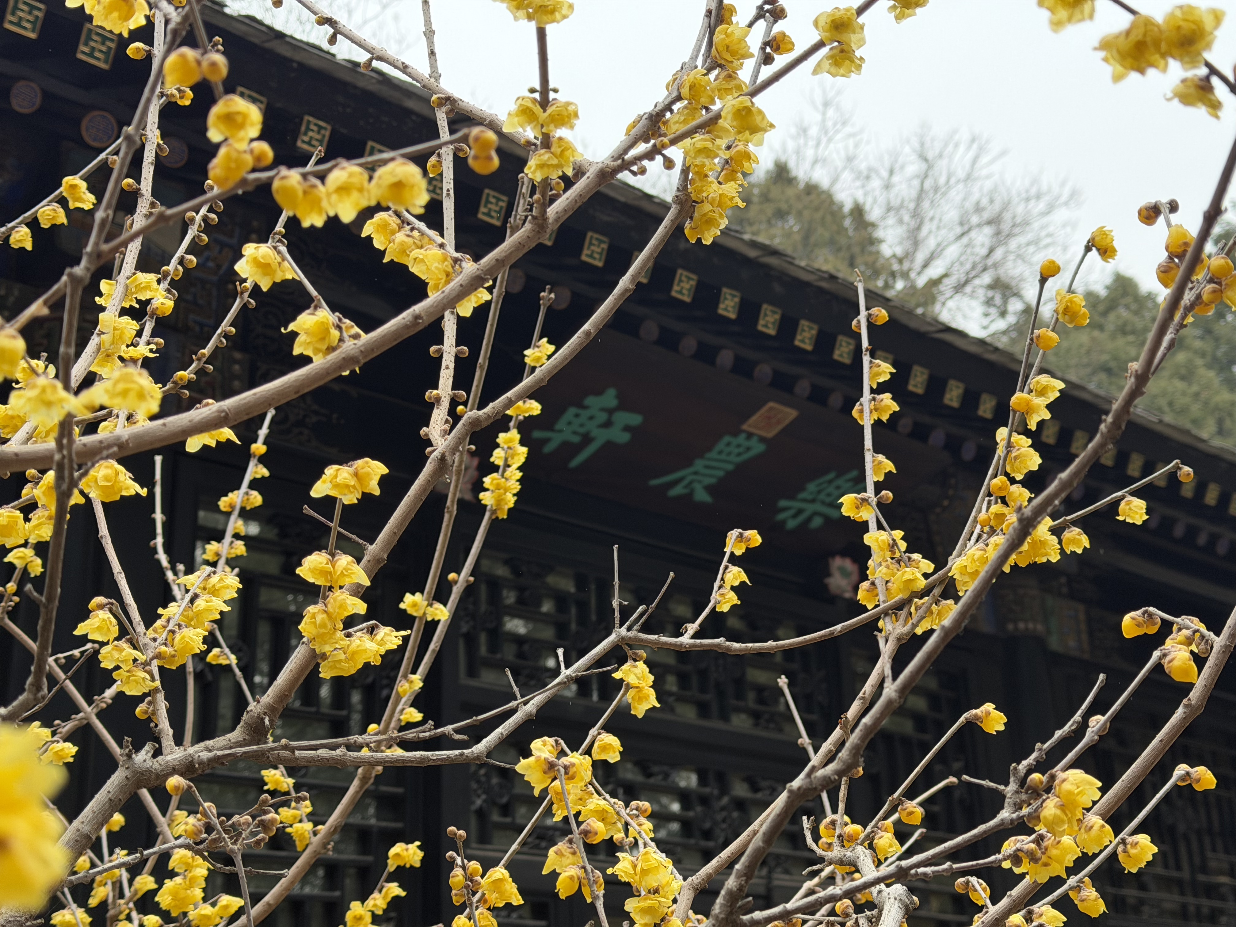 在颐和园乐农轩门前,青砖砌墙、石片盖顶的朴素屋舍前,一簇簇鹅黄色的蜡梅花缀满枝头,花量较往年明显增多。颐和园园林科技科科长赵晓燕介绍,这得益于今冬对蜡梅的精细养护,加上两场大雪为蜡梅补充了充足的水分,使得花开得格外繁盛。