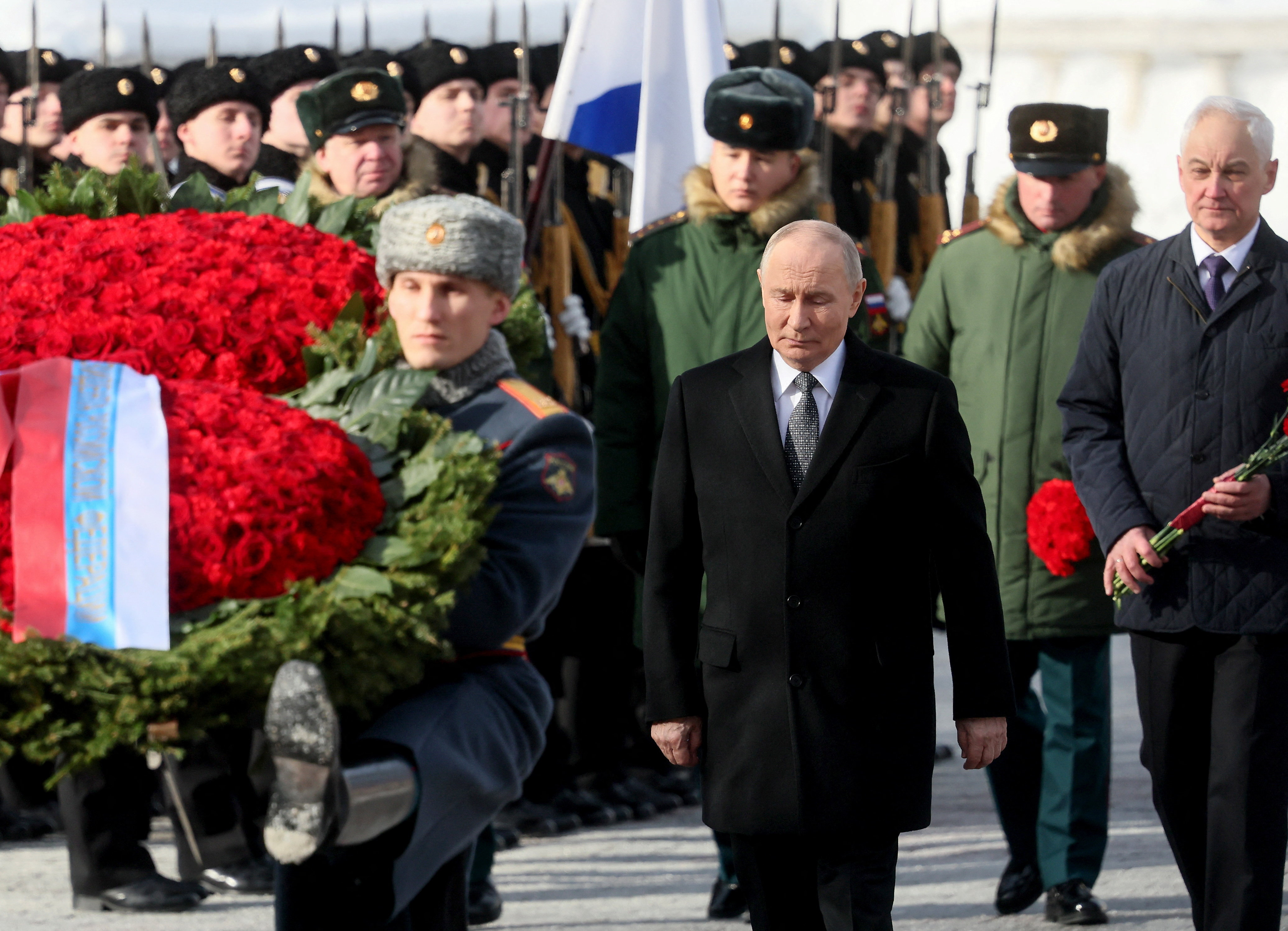 当地时间2026年2月23日,俄罗斯莫斯科,纪念“祖国保卫者日”,俄总统普京向无名烈士墓献花。图/IC photo