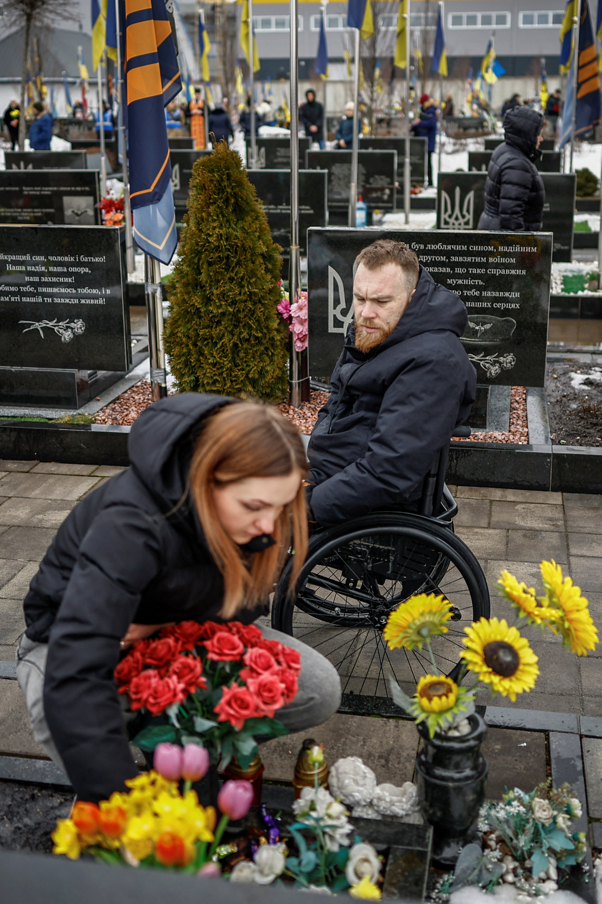 当地时间2026年2月24日,乌克兰基辅州布恰镇,一对夫妇在当地公墓的英雄大道献花,悼念受害者。图/IC photo