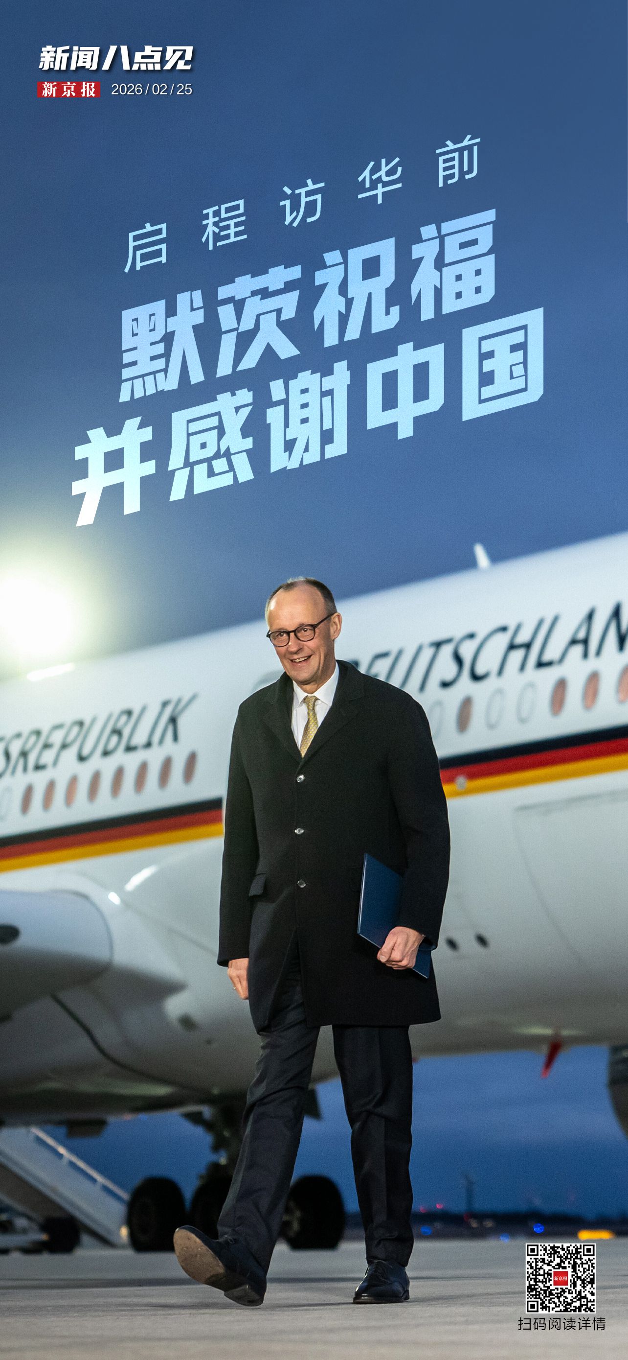 据中央广播电视总台CMG国际时讯报道,当地时间2月24日,德国总理默茨启程访华。在柏林机场发表讲话时,默茨再次向中国人民致以新春祝福,并感谢中方在春节这一特别的日子里接待他访问。此时,距离默茨当选总理已近9个月。