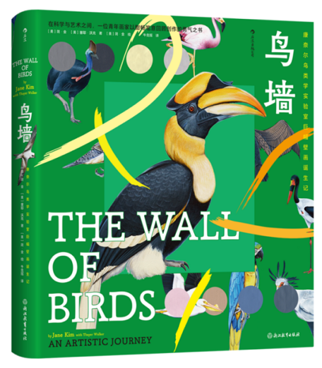 得益于该实验室自创立之初就融入发展的美学意识,真有一位擅长墙画的青年艺术家从相关的驻地项目中脱颖而出。她就是《鸟墙——康奈尔鸟类学实验室巨幅壁画诞生记》一书的主创之一:简·金。从选中构图的焦点到平衡远与近、全局与细部、科学与艺术,简·金持画笔与胆略,发挥专长又善于合作。她与鸟类学家和古生物学家一起,从现生鸟类的各个科、已经灭绝的物种、不是鸟类但和鸟类共有同一古老起源的,还有因人类捕杀而灭绝的各科鸟中选出代表,遍历各个大陆,以真鸟大小画下一场跨越3.75亿年的演化之旅。