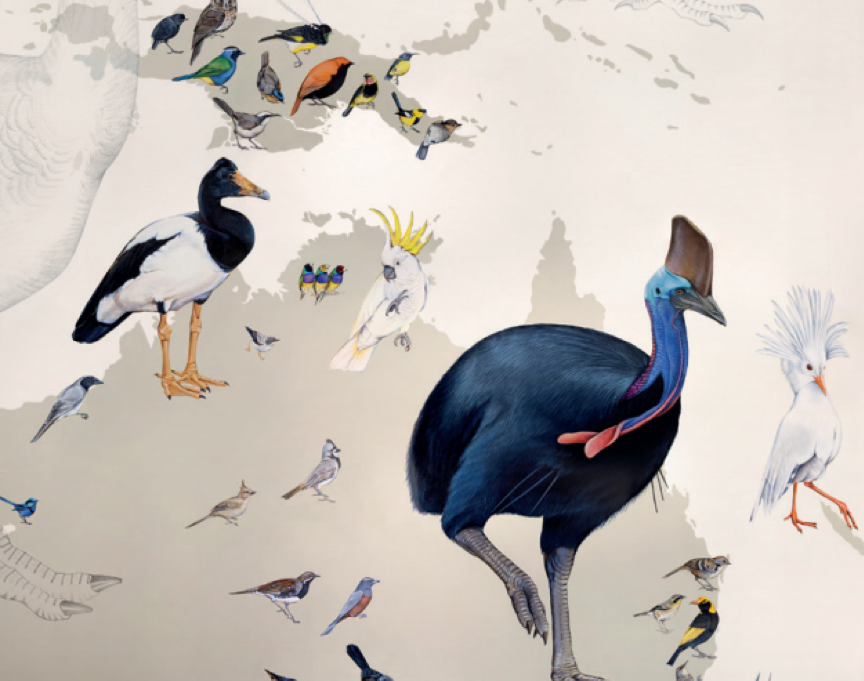 特别是在真正往墙上绘制的17个月间,麦考利图书馆电子收藏实验室的主任(也是一位卓有成就的艺术家)杰茜·巴里在物种的体态和比例方面为简提供了大力帮助,确保了精确性。我们从物种的甄选一路争论到它们每个在墙上最终的位置,激烈碰撞的同时也做出了不少让步和妥协,乐在其中。几个物种甚至“迁徙”了好几个大陆才最终回到最适合它们的“家”。简理所当然是敲定音槌的人,她在大尺寸作品的设计美学和保全内容的科学性之间找到了完美的平衡。简还坚持用极简的设计——不需繁枝、水体或其他展现栖息地的道具,只保留最自然姿态下的鸟儿。我坦白,我曾经不太赞同这么做,但幸好简坚持了下来。就如本书展现的,她笔下“纯粹的鸟像”是那么自然,又是那么超凡。