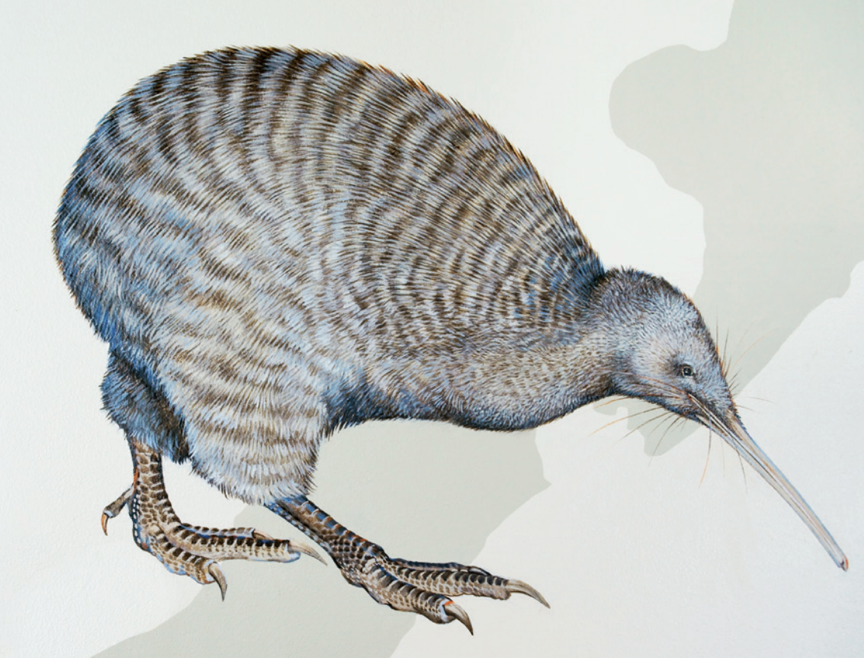 从外观上说,墙上没有一只鸟长得哪怕有一点接近大斑几维。几维鸟在19世纪刚被描述并记录下来的时候,自然爱好者们看到这个怪异的身体结构还以为是什么人在搞恶作剧。生物学家史蒂芬·杰·古尔德曾把几维鸟比作“两根小棍支撑着的胖乎乎两团肉球”。虽然外观构造上稍欠精巧——但没准正是出于这个原因,几维鸟才成了新西兰的文化符号。