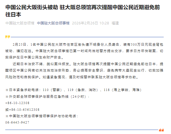 近期日本治安不靖,类似案件频发。驻大阪总领馆再次提醒中国公民近期避免前往日本,提醒领区中国公民密切关注当地治安形势,务必提高安全意识,避免携带大量现金出行,切实加强风险防范和自我保护。如遇紧急情况,请及时报警并联系驻大阪总领馆寻求协助。