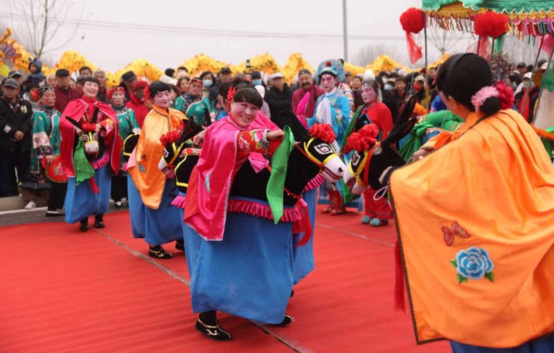 2月26日,大兴区礼贤镇第三届新春文化季正式启幕,活动从正月初十持续至正月十五,汇集非遗表演、市集、游艺等丰富内容,将浓浓年味送到大兴临空区回迁居民家门口。图为回迁居民表演小车会。