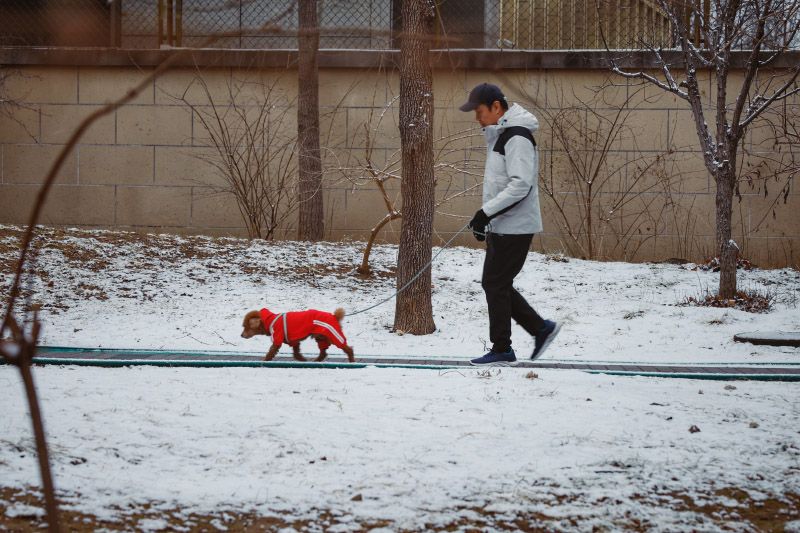 2月27日,大兴天宫院,一位男士雪中遛狗,踏雪而行。北京市气象台27日6时发布:今天早晨山区有零星小雪,白天阴转多云,偏南风二三级,最高气温7℃;夜间多云转阴,南转北风一二级,最低气温-1℃。部分路段湿滑,出行请注意交通安全。今日气温下降,体感阴冷,外出注意添衣保暖。目前,延庆、怀柔、密云、平谷、昌平、房山、门头沟处于道路结冰黄色预警信号中,请注意防范。