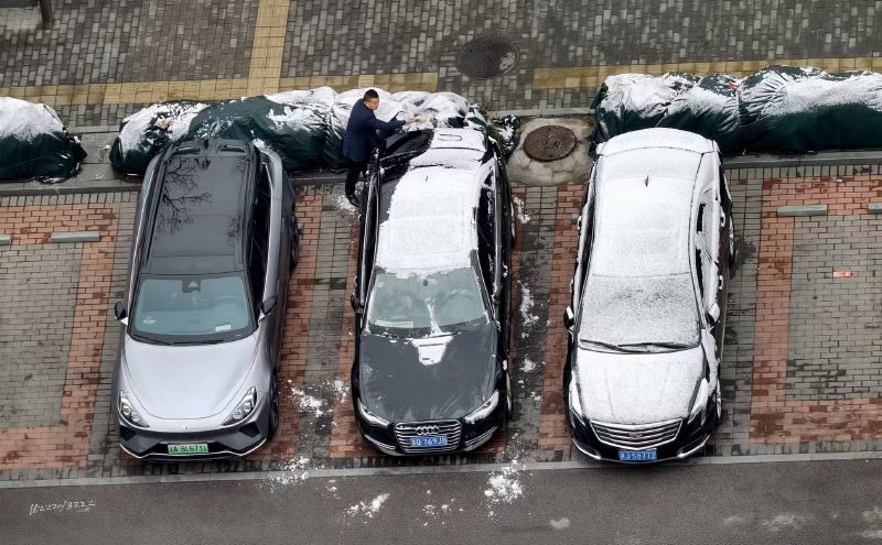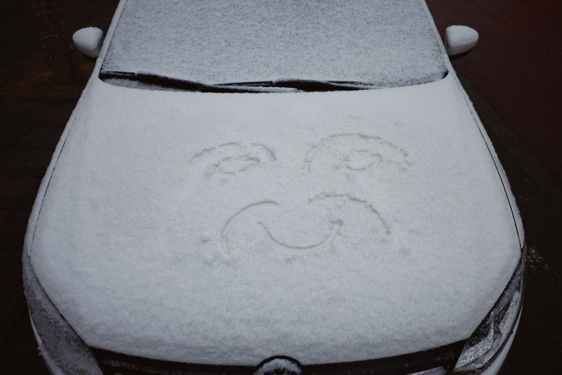2月27日,大兴天宫院,路边汽车引擎盖上铺满薄雪,有人在上面留下“笑脸”。