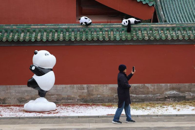 2月27日,日坛公园,熊猫玩偶覆盖一层白雪。