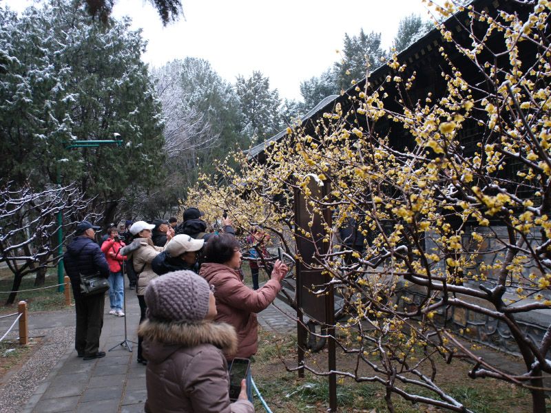 2月27日,颐和园,市民观赏雪中蜡梅。
