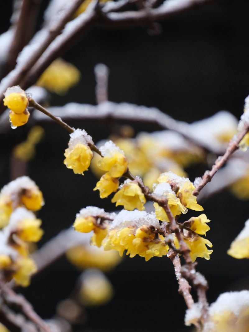 二月春雪落京城,蜡梅玉兰双娇争艳