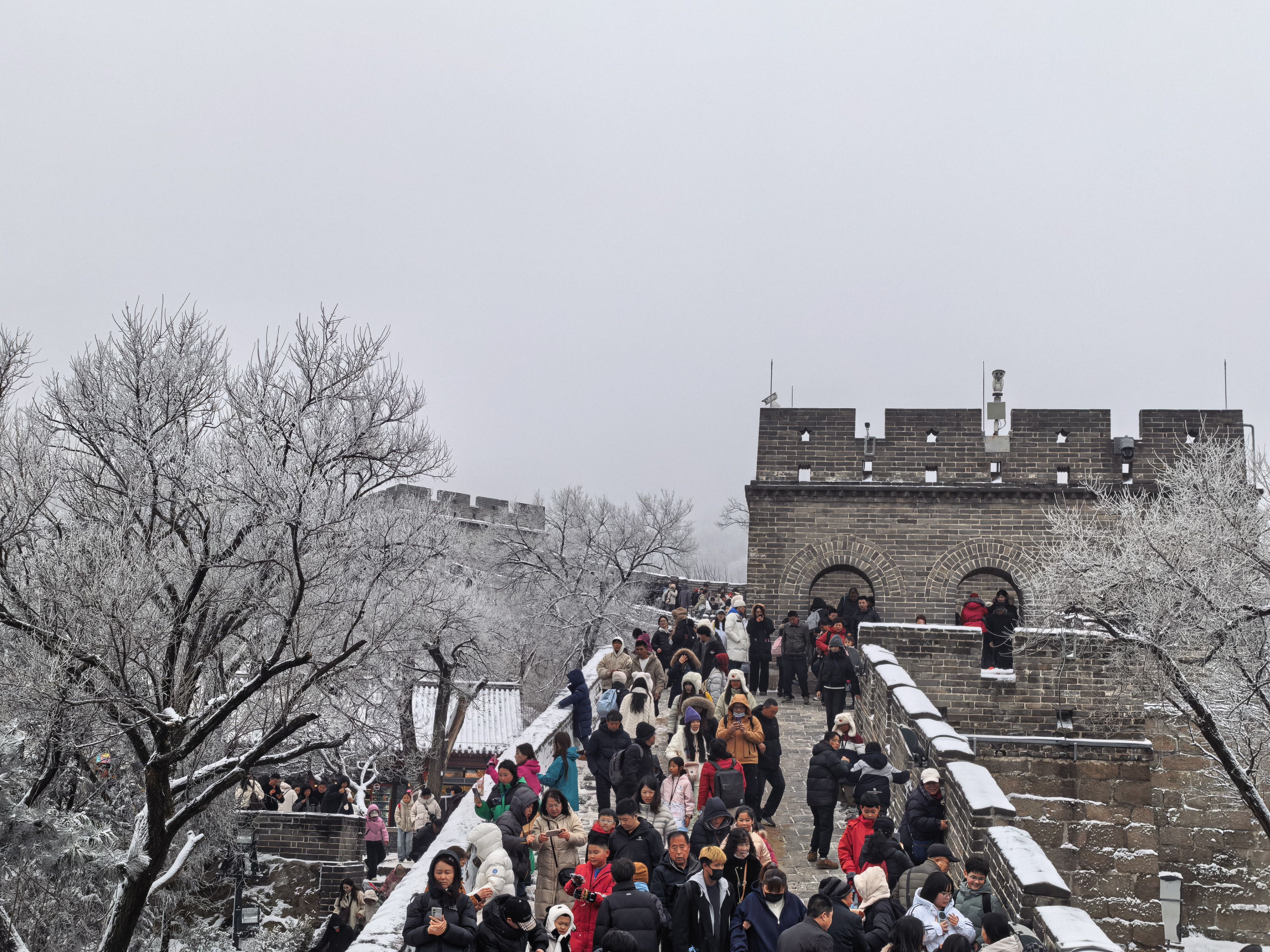 目前,八达岭景区各项保障措施到位,游客可放心前往,共赏这春节后的第一场雪景盛宴。同时提醒游客,山区气温较低,路面湿滑,请注意防寒保暖,在工作人员引导下安全游览。