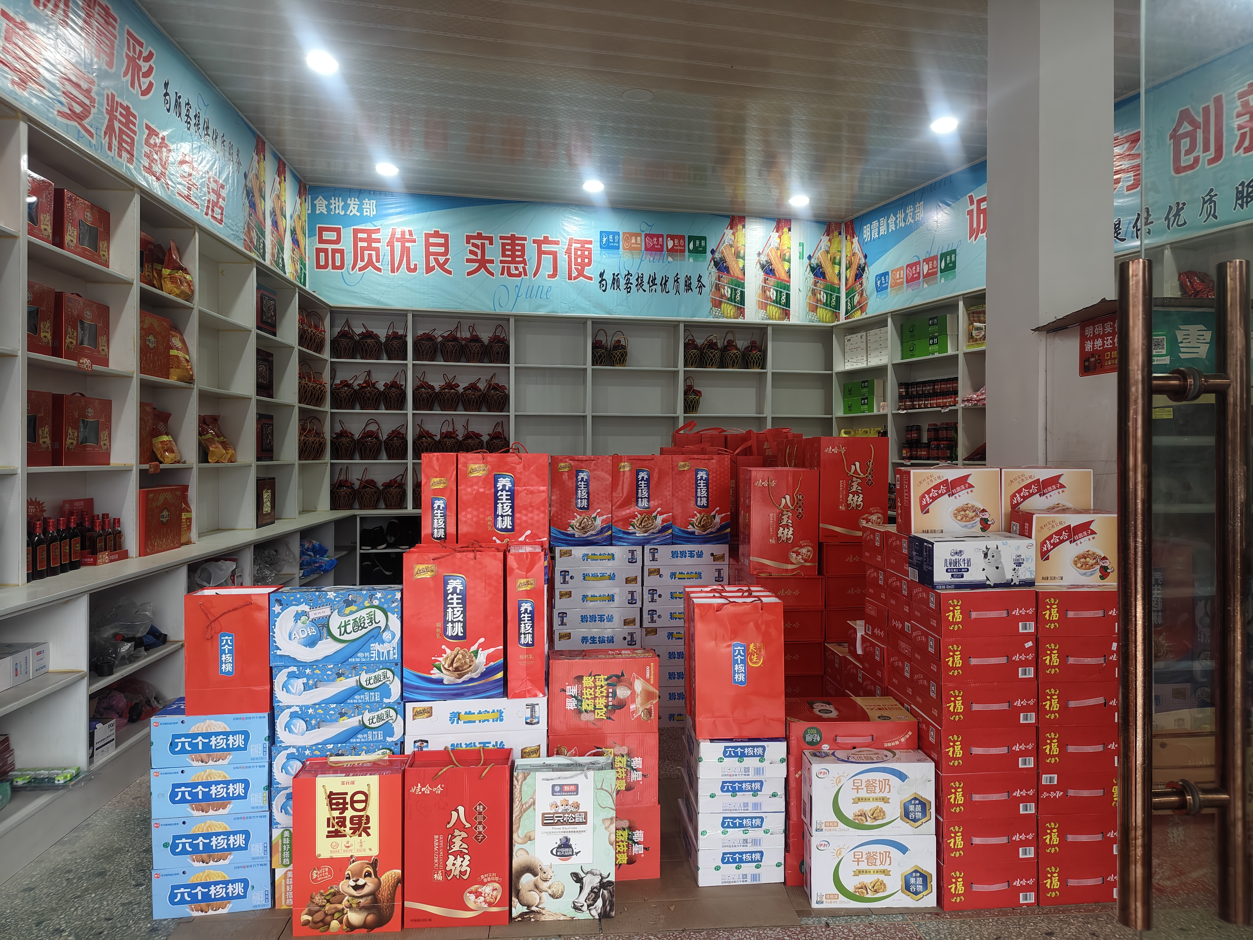 店面扩大,店里的商品也迎来了焕新升级。当然,店里那些经济实惠的刚需用品仍在售卖,但商品变得丰富多样了起来,桶装泡面、牌子饮料、面食甜点、奶制品等不一而足。鉴于村里消费存在显著的潮汐效应,过年前长明还会特意去县里进一批“高档货”,满足村民置办年货和走亲访友的需求。春节前后,盒装酒、蜂王浆、豆奶粉、麦片等在当时看来非常拿得出手的商品开始整齐码放在货架的显眼处。“元宵节过后,架上的这些货基本就卖空了,村里的青壮年也该走了。”长明分享了自己的观察。