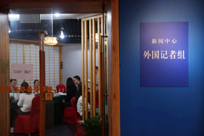 工作人员在新闻中心外国记者组开展工作。