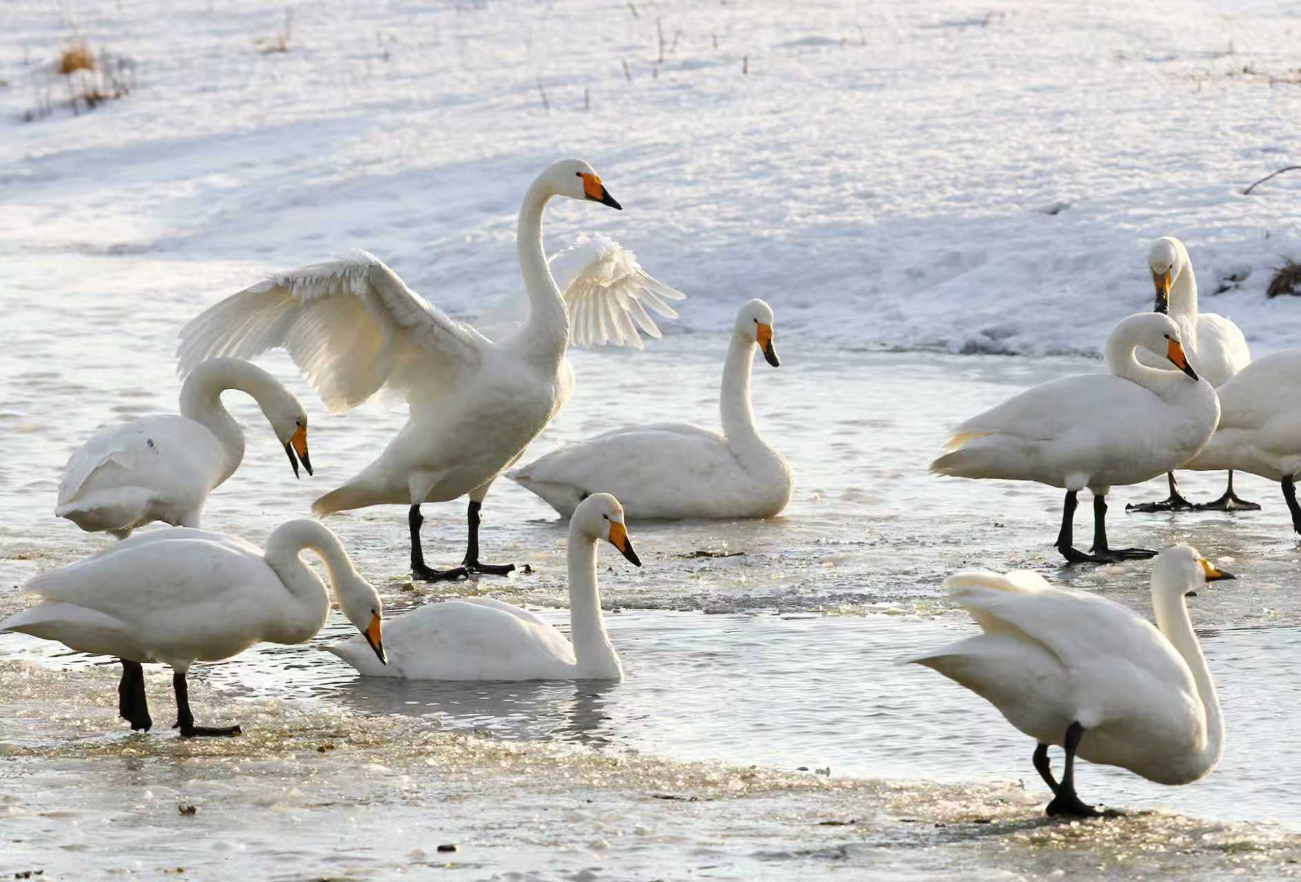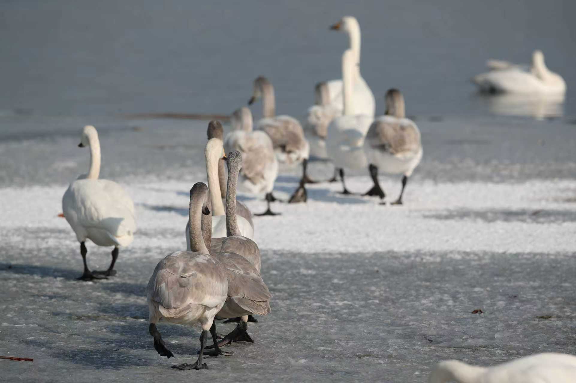 灰色亚成体天鹅行走在水库冰面上。库区目前有大约1.2万只候鸟。按照目前的攀升速度来算,今春的迁徙高峰期大约在3月中旬前后。