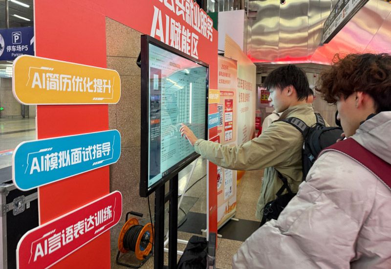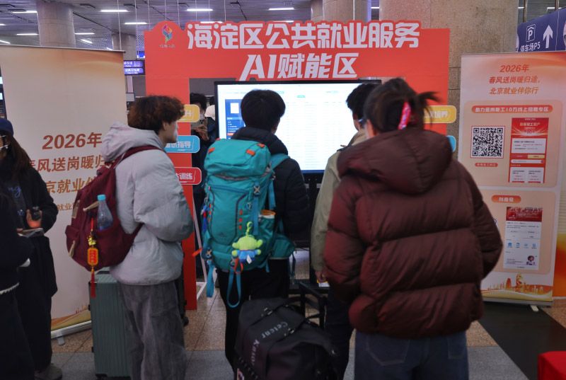 2月27日,北京西站,出站旅客在AI赋能区查找工作信息。求职者还可通过北京市人社局官方网站、京通小程序中查找“就业在北京”就业服务平台,一键查找心仪岗位,实现刚下“返京列车”,就上“就业快车”。