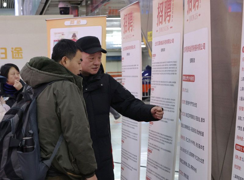 2月27日,北京西站,求职者观看招聘信息。10万个岗位中,既有机器人工程技术、无人机研发、航空设备制造、人工智能设计等前沿岗位,也有家政服务、康养照料、母婴护理等社会生活紧缺岗位,还有普工及操作工等先进制造业紧缺的技能型人才岗位。