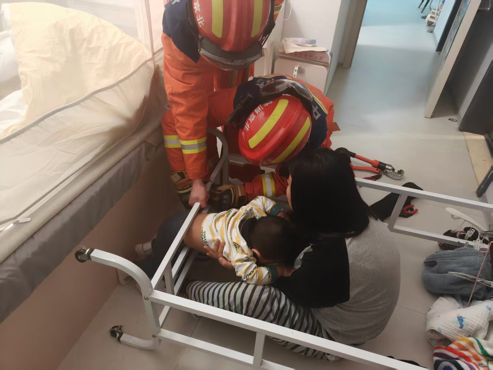 随着大力钳发力,只听“咔嚓”一声脆响,不到1分钟,那根卡住幼童的钢管应声而断。消防员顺势将掰开的缝隙扩大,小心翼翼地护着孩子的腰部和背部,将其从晾衣架中抱了出来。
