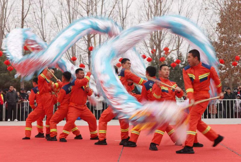 消防队员组成的舞龙队在锣鼓声中精彩亮相,动作刚劲有力、气势十足。