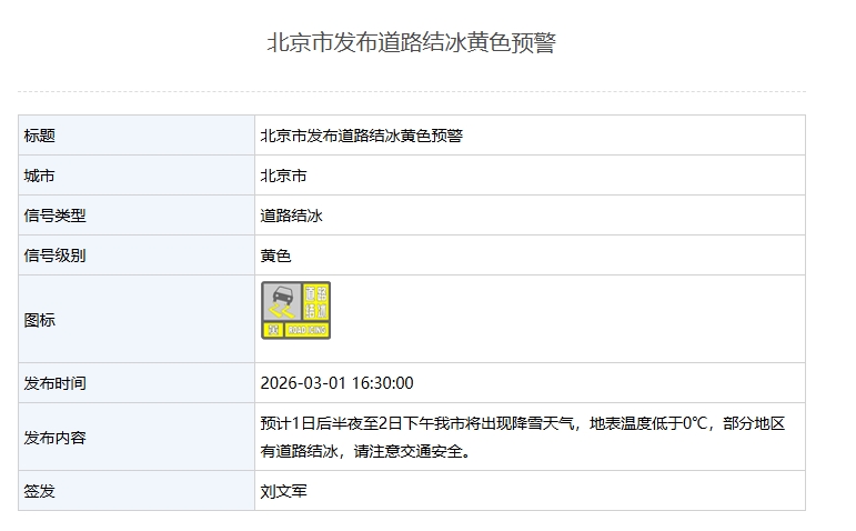 新京报讯 据北京市气象局网站消息,北京市发布道路结冰黄色预警:预计1日后半夜至2日下午我市将出现降雪天气,地表温度低于0℃,部分地区有道路结冰,请注意交通安全。