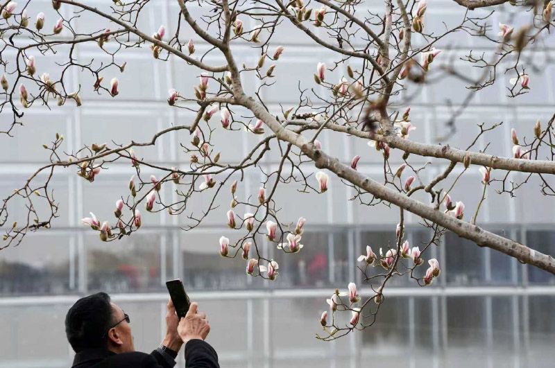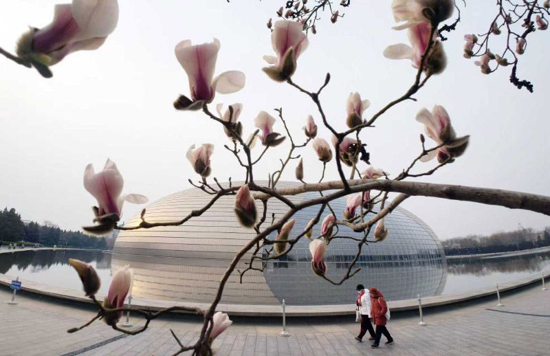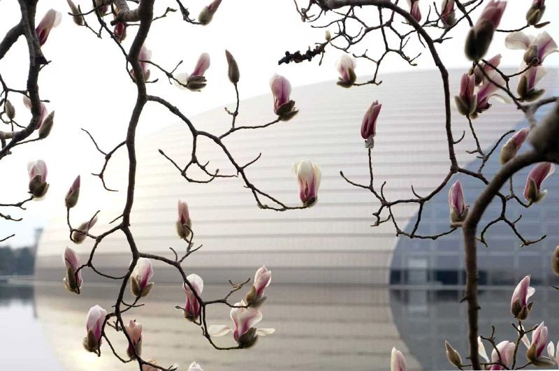3月1日,长安街国家大剧院前的数株玉兰携春风悄然绽放,满树繁花,美不胜收,吸引众多市民游客前来拍照打卡 。