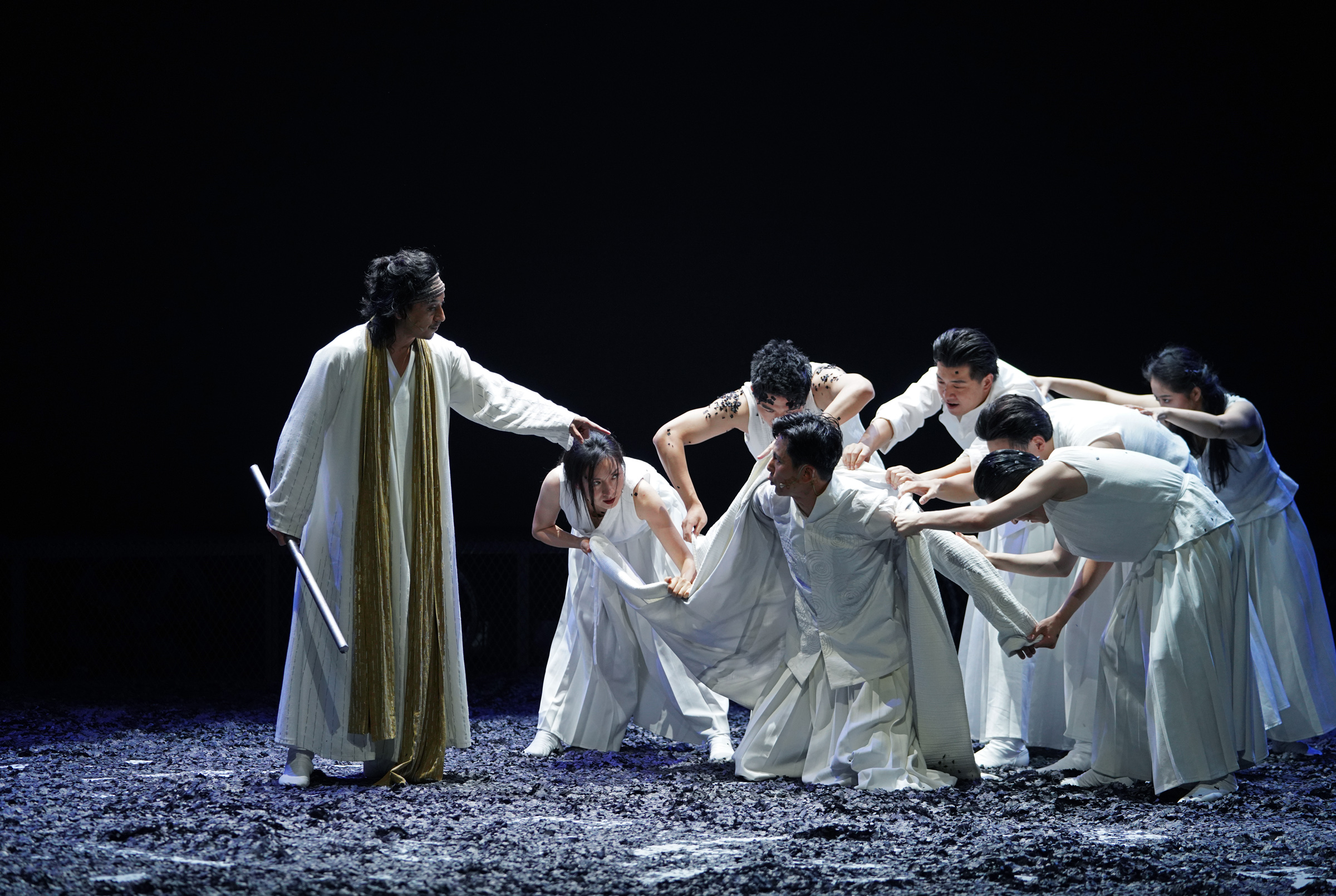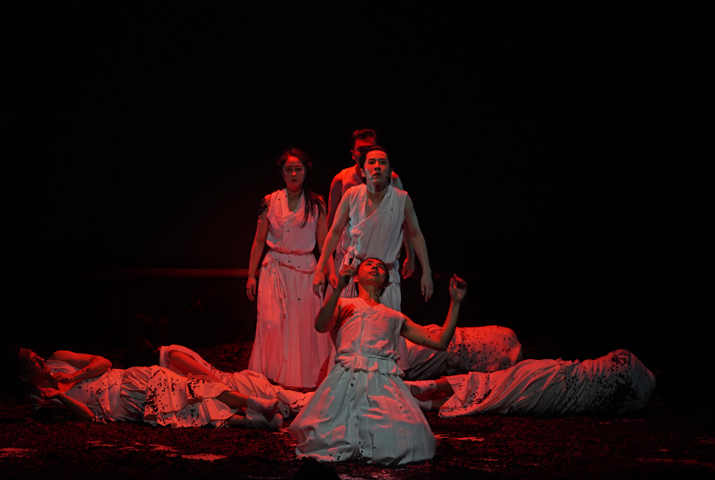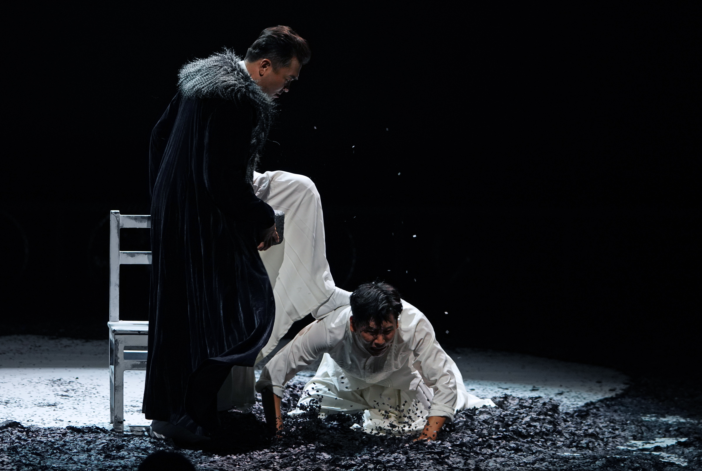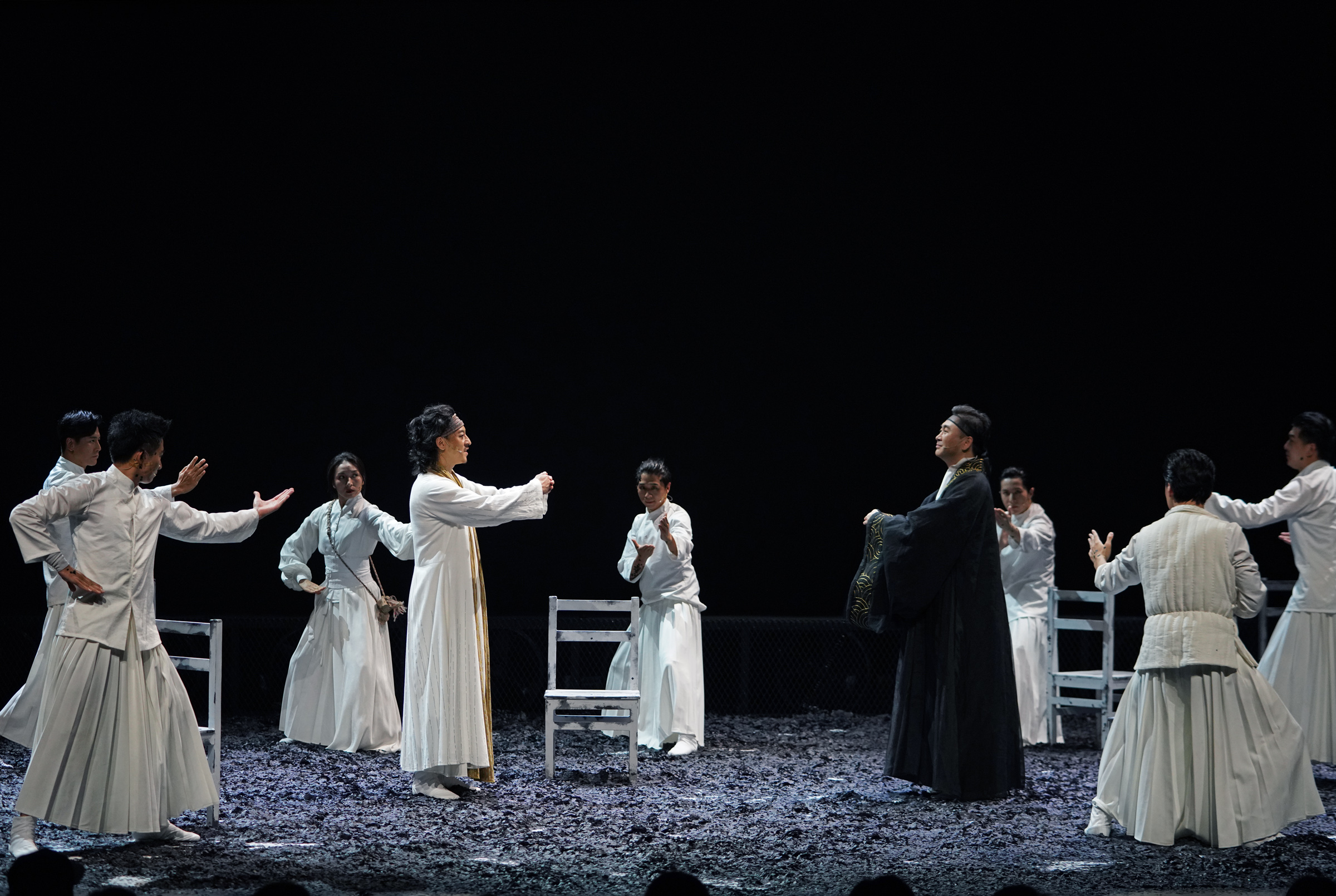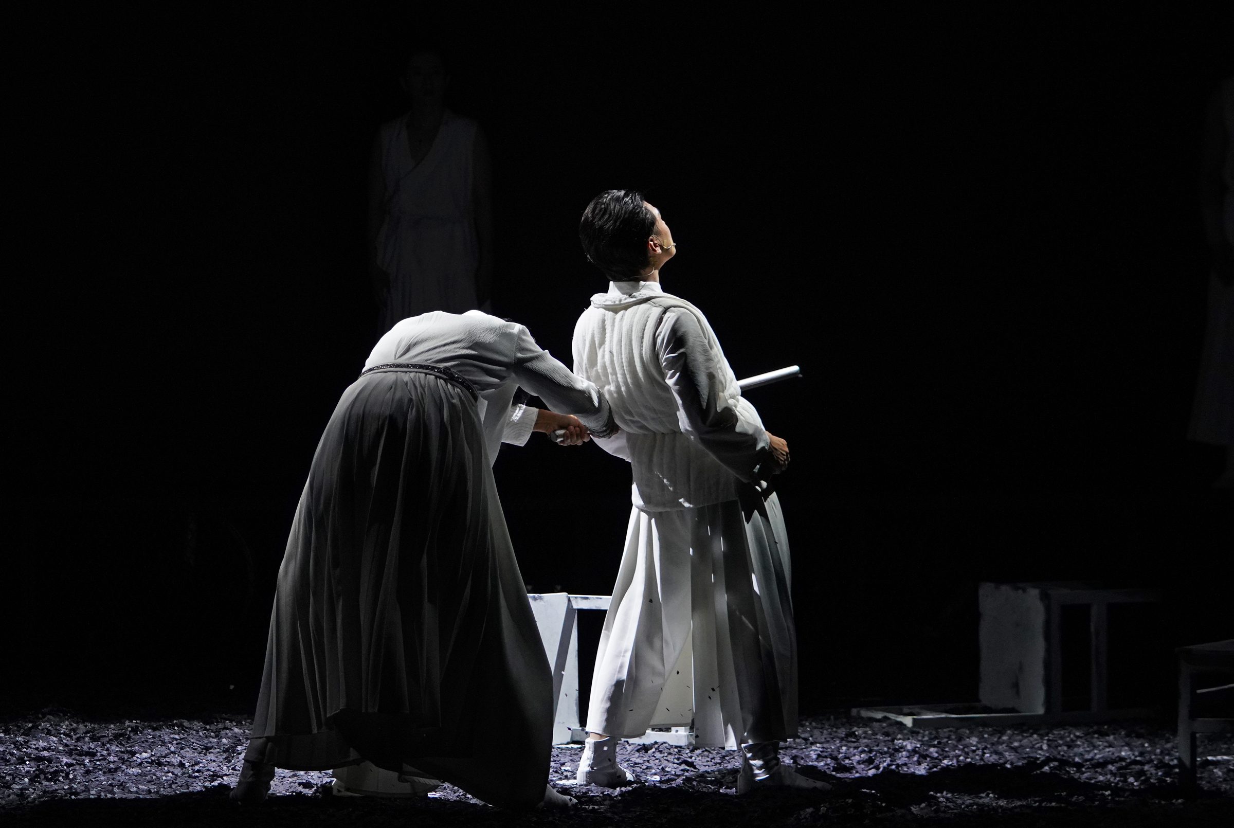“黑的空间”则是用黑暗铺天盖地地笼罩下来,不留空隙的压迫感。“黑”不只是一个极简的背景,而是成为整个戏剧的核心意象和主题载体;更重要的是,也是观者感知剧中人事的媒介或条件。黑暗成为一种几乎有形的力量,可以渗透每一个在场者的所有感官与直觉——包括剧场中,你能够呼吸的空气。