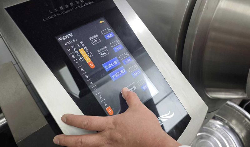3月2日,鸦儿胡同小学“微厨房”,厨师根据菜品特点,设置智能炒菜机器人参数。
