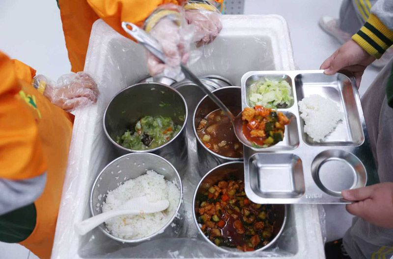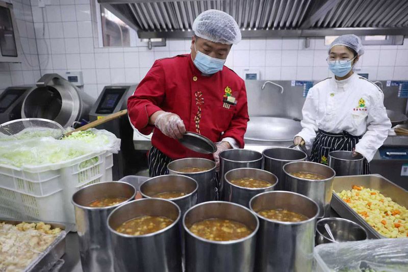 3月2日中午,鸦儿胡同小学“微厨房”,厨师将做好的饭菜分别装入保温桶。